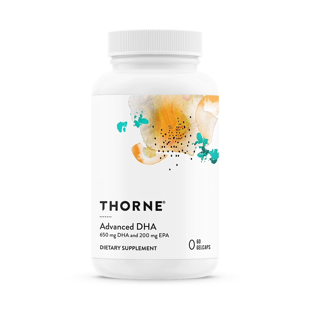 Because the body makes very little DHA or EPA naturally, it is essential that these fatty acids be acquired by diet or supplementation. Thorne’s Advanced DHA is a high-DHA/moderate-EPA fish oil supplement. Containing 650 mg DHA and 200 mg EPA per 2-gelcap serving, Advanced DHA is the perfect choice for cognitive support of the aging brain.*