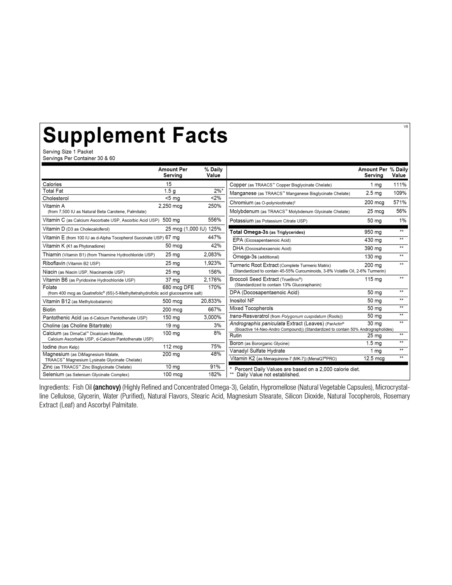 Good nutrition promotes health, while nutritional deficiencies can lead to many chronic diseases. Yet, many people underestimate the importance of achieving proper levels of essential nutrients each day. For the human body to complete vital daily tasks, it must be given a wide and complex variety of key nutrients. Nutritional deficiencies may be caused by drug-induced nutrient depletion, poor food choices, inadequate nutrient levels in soil, and improper food transport and food processing techniques. Combine this with the impact of a high-stress, fast-paced modern lifestyle, and ensuring foundational nutrition each day becomes essential. Alpha Base Premier Packs provide a targeted combination of three high-concentration nutritional formulas in convenient, easy-to-take packets. Each pack includes Alpha Base Capsules without Iron, a hypo-allergenic, comprehensive, high-quality blend of bioavailable vitamins and minerals. Orthomega 820 is also included, and contains 430 mg of eicosapentaenoic acid (EPA) and 390 mg of docosahexaenoic acid (DHA) omega-3 fatty acids per soft gel. Finally, each pack includes Resvoxitrol, a unique combination of phytonutrients designed to enhance antioxidant potential in the body. Suggested Use: 1 packet per day or as recommended by your health care professional