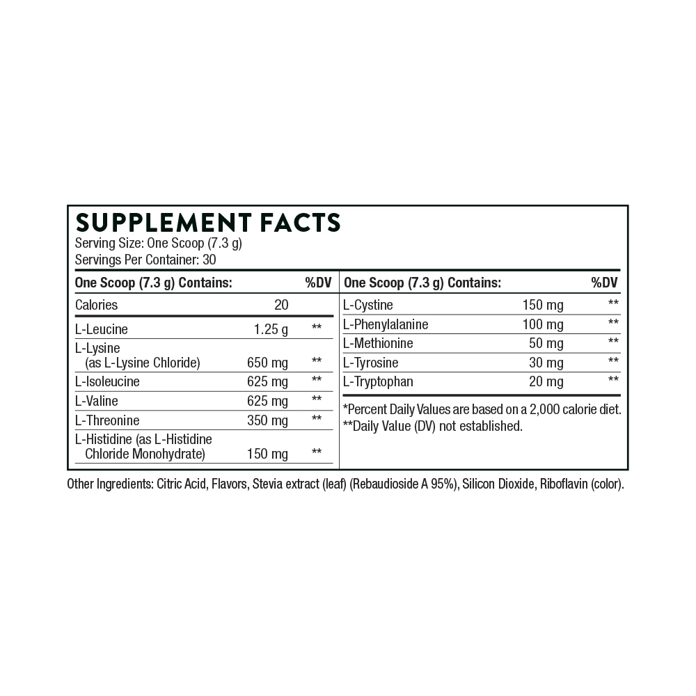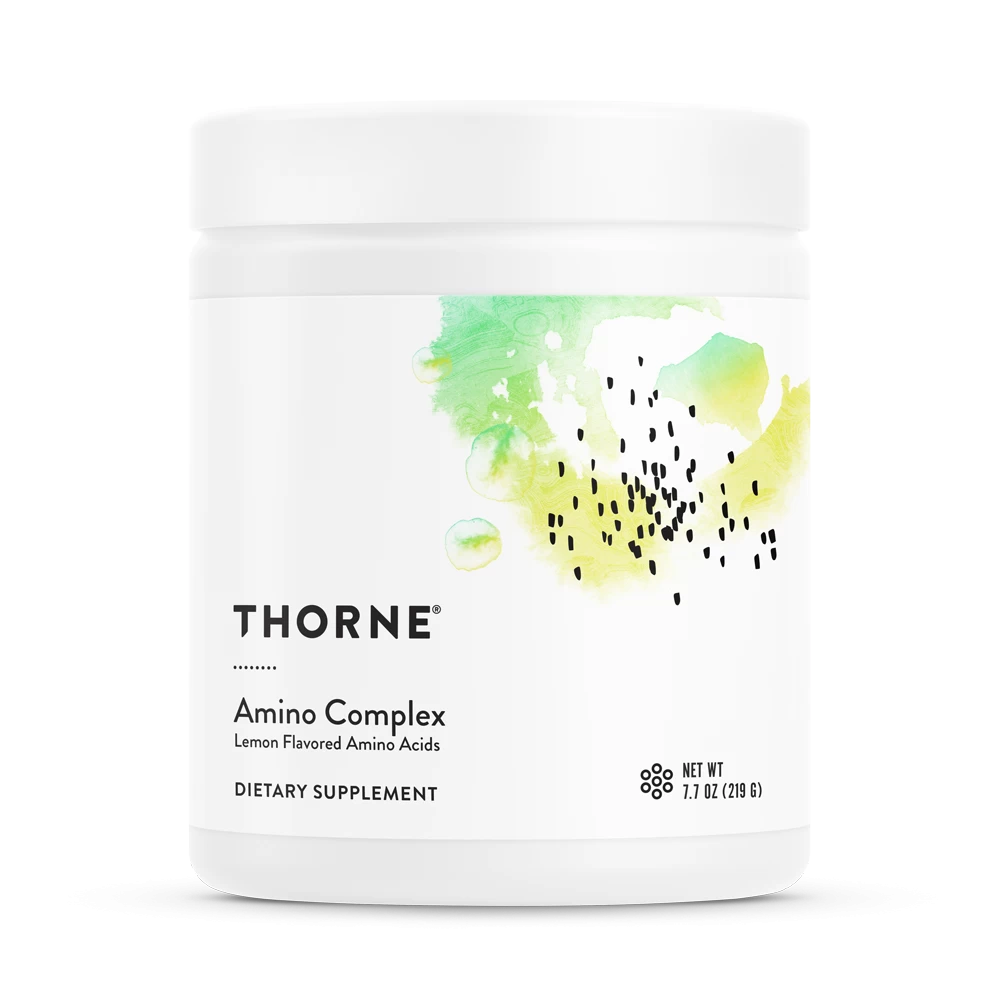 Optimize your workout results and build the lean muscle mass that boosts strength..* The Amino Complex formula also enhances cellular energy production. Amino acids are the building blocks of protein. They fuel muscle gain and other physiological functions, including enzyme production, hormone regulation, cognitive ability, neurotransmitter balance, metabolism, and energy production..* As we age, we lose muscle mass, which can cause other health issues, so it is important to promote the growth of lean muscle mass. Of the 20 amino acids in total, nine are classified as essential amino acids (EAAs), those the body cannot produce itself. Therefore, they must be consumed through diet and supplementation to support the body’s internal production of energy.* Thorne’s Amino Complex is a comprehensive blend of essential amino acids, which is high in branched-chain amino acids (BCAAs) – a group of amino acids validated through clinical trials to promote the growth of lean muscle mass and enhance muscle strength. EAAs benefit the body in multiple ways: