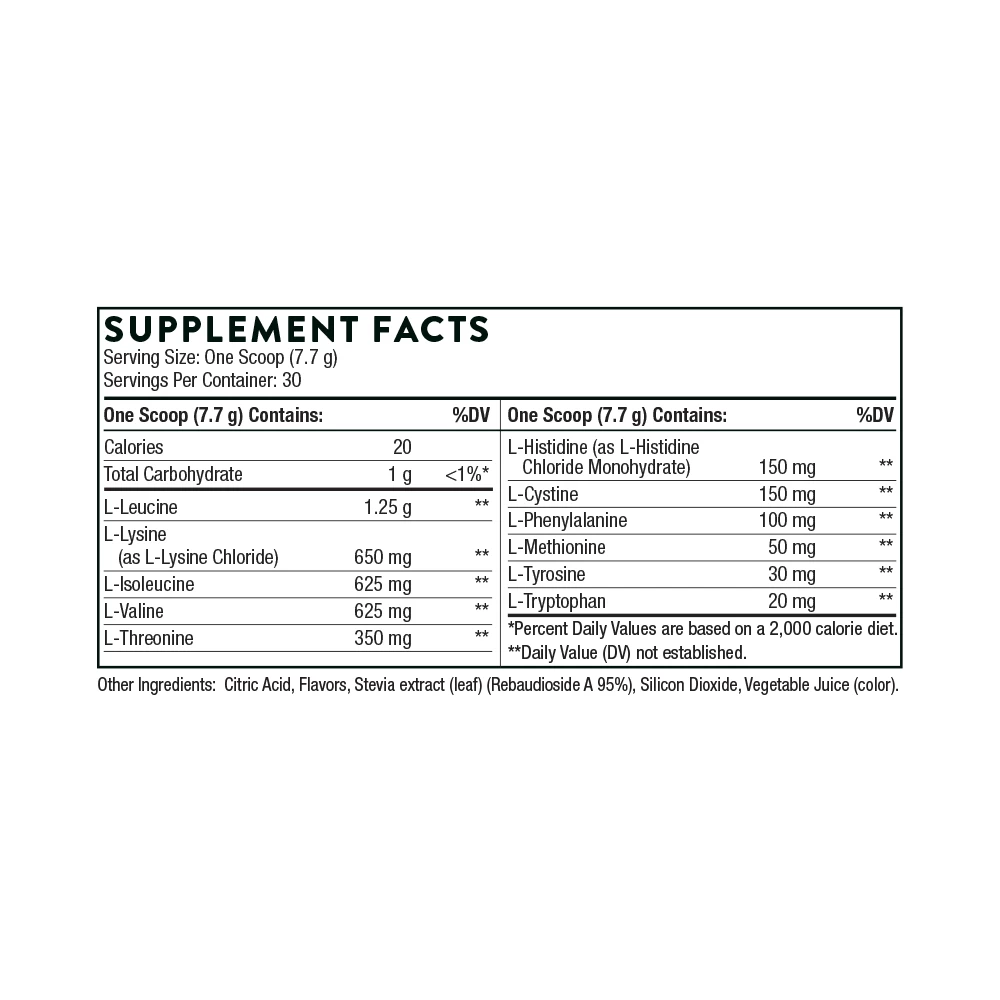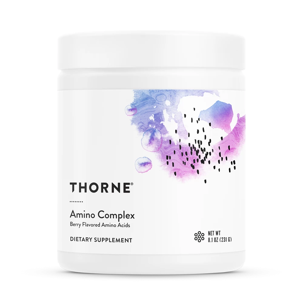 Optimize your workout results and build the lean muscle mass that boosts strength..* The Amino Complex formula also enhances cellular energy production. Amino acids are the building blocks of protein. They fuel muscle gain and other physiological functions, including enzyme production, hormone regulation, cognitive ability, neurotransmitter balance, metabolism, and energy production..* As we age, we lose muscle mass, which can cause other health issues, so it is important to promote the growth of lean muscle mass. Of the 20 amino acids in total, nine are classified as essential amino acids (EAAs), those the body cannot produce itself. Therefore, they must be consumed through diet and supplementation to support the body’s internal production of energy.* Thorne’s Amino Complex is a comprehensive blend of essential amino acids, which is high in branched-chain amino acids (BCAAs) – a group of amino acids validated through clinical trials to promote the growth of lean muscle mass and enhance muscle strength. EAAs benefit the body in multiple ways: