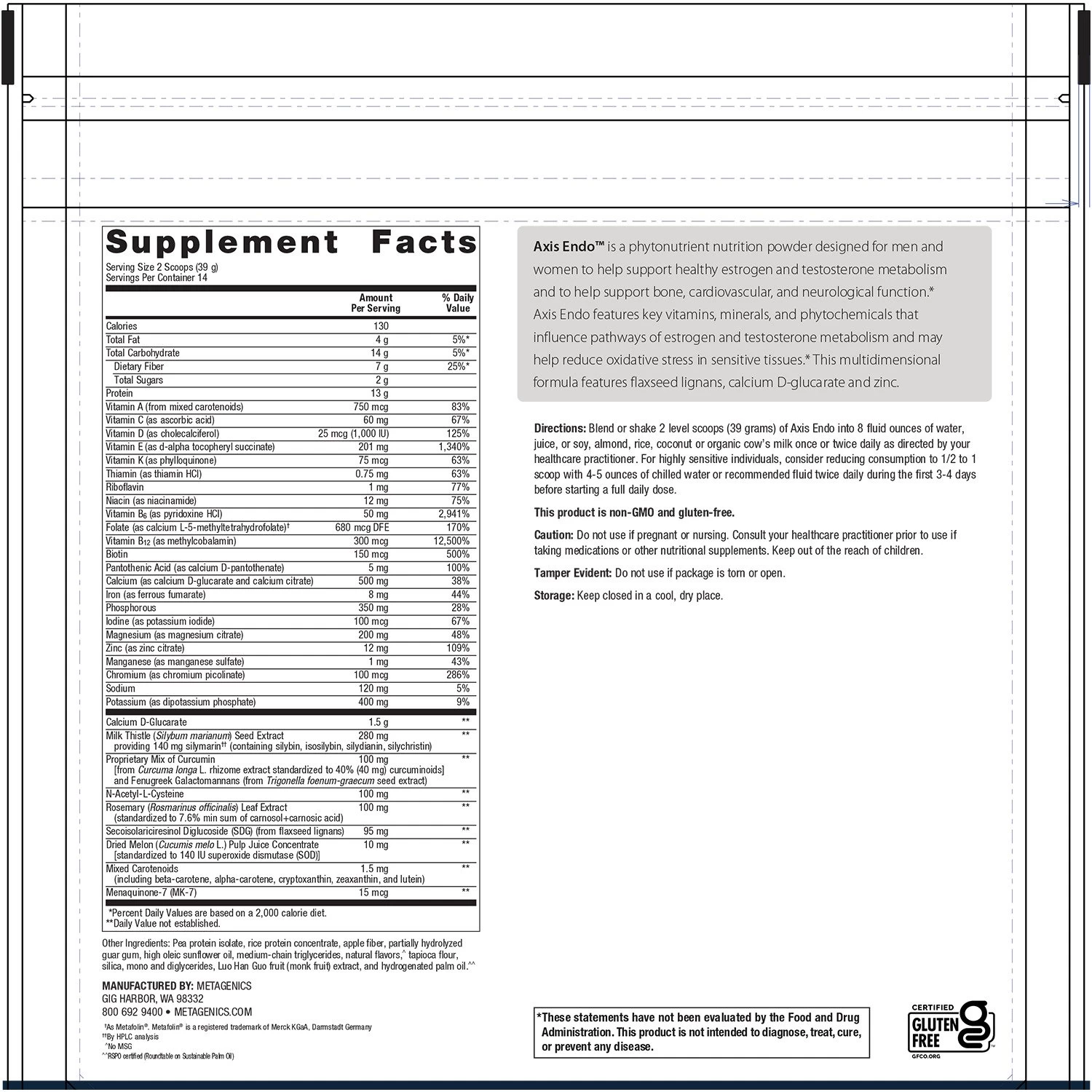 Other Ingredients: Pea protein isolate, rice protein concentrate, apple fiber, partially hydrolyzed guar gum, high oleic sunflower oil, medium-chain triglycerides, natural flavors,^ tapioca flour, silica, mono and diglycerides, Luo Han Guo fruit (monk fruit) extract, and hydrogenated palm oil.^^ Directions: Blend or shake 2 level scoops (40 grams) of Axis Endo into 8 fluid ounces of water, juice, or soy, almond, rice, coconut or organic cow’s milk once or twice daily as directed by your healthcare practitioner. For highly sensitive individuals, consider reducing consumption to 1/2 to 1 scoop with 4-5 ounces of chilled water or recommended fluid twice daily during the first 3-4 days before starting a full daily dose. This product is non-GMO and gluten-free. Caution: Do not use if pregnant or nursing. Consult your healthcare practitioner prior to use if taking medications or other nutritional supplements. Keep out of the reach of children.