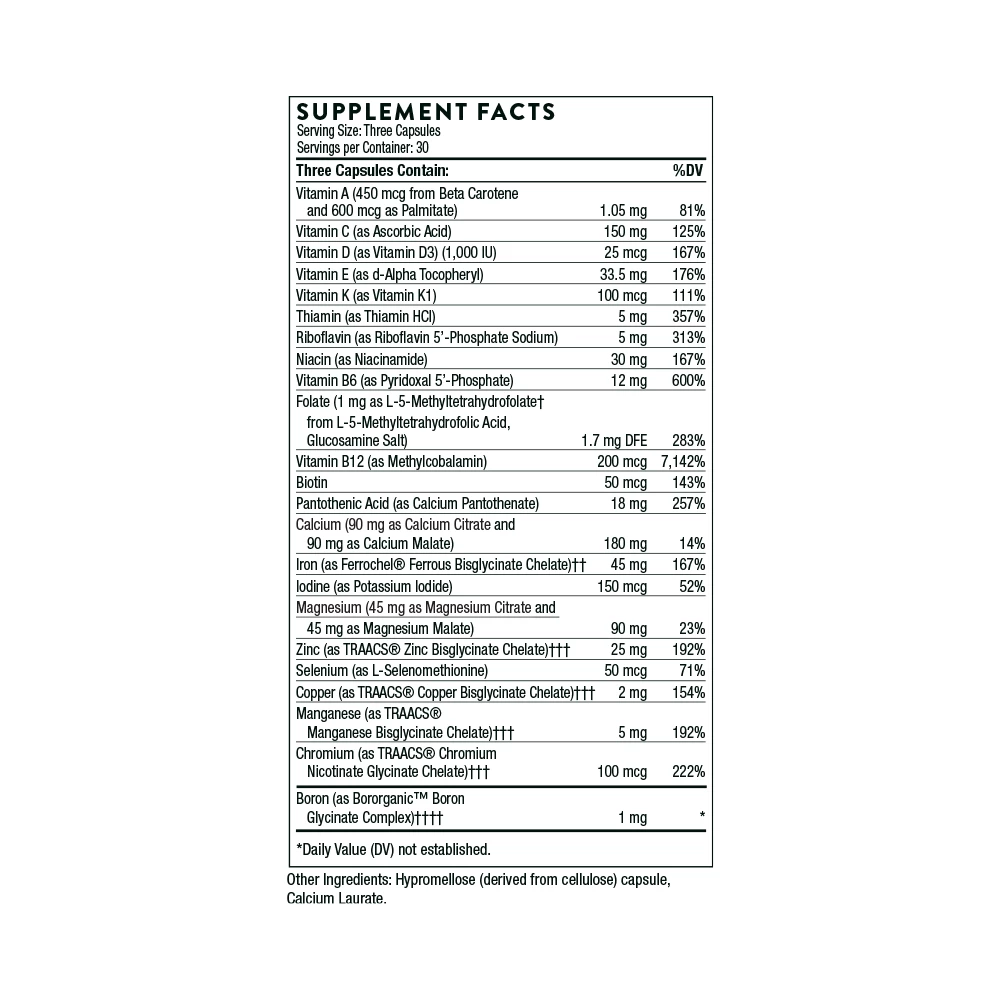 Pre-conception, pregnancy, and nursing are critical times to optimize a mother’s health and nutrition, which is important for both for mom and baby. Overall nutritional and caloric needs greatly increase during this time. However, it is often difficult for a woman to fulfill her daily nutrient needs through diet alone. Thorne’s Basic Prenatal is specifically formulated with the special needs of conception, pregnancy, and breastfeeding in mind.* Our formula contains well-absorbed, tissue-ready vitamins and minerals that are gentle on the stomach and non-constipating.*