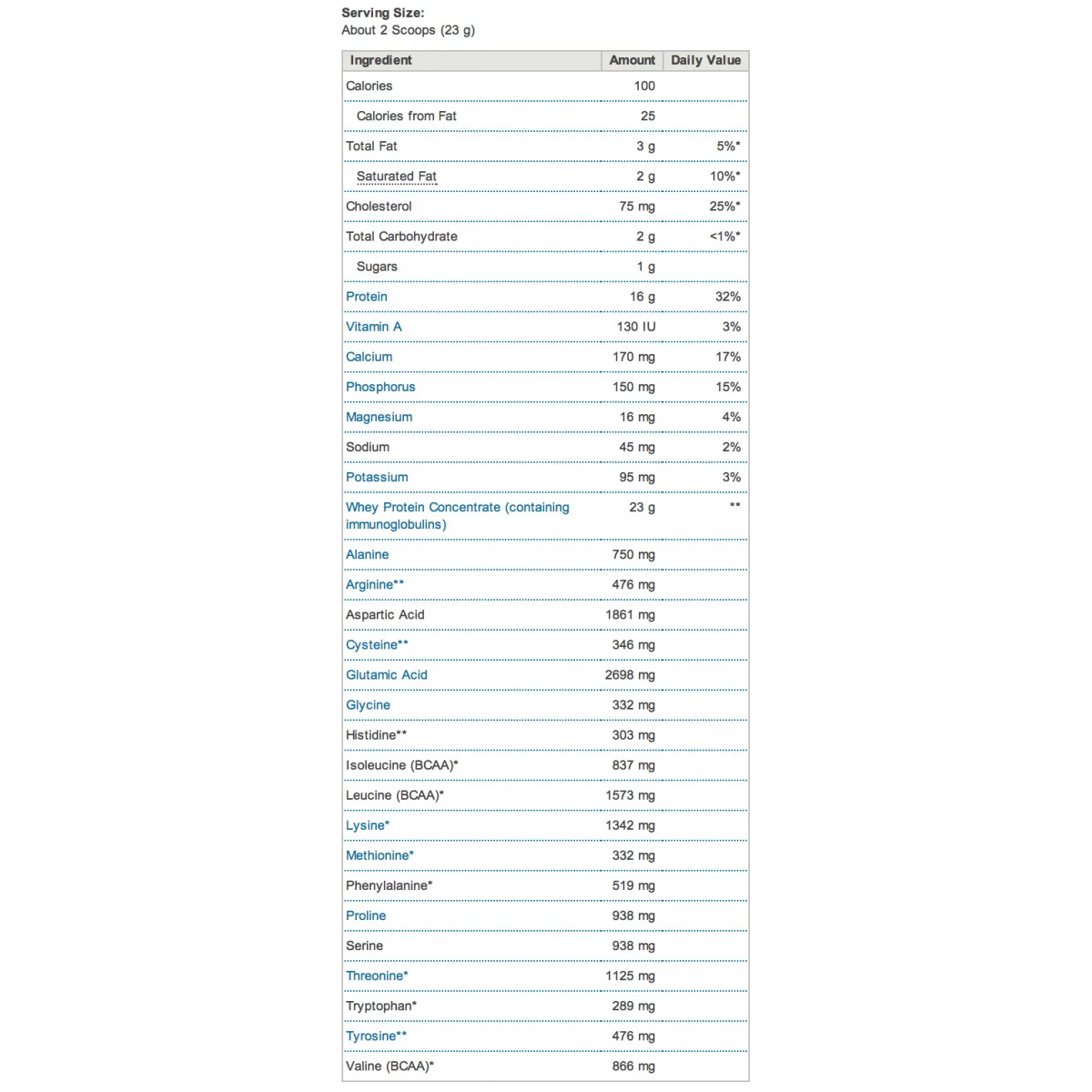 | Whey Protein Concentrate (containing immunoglobulins) | 23 g | ** |