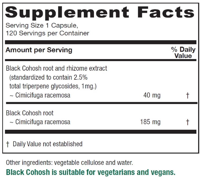 For the best of both worlds, this product combines the standardized extract and dried powder of the black cohosh root. Black Cohosh is a popular Native American and folk remedy for female ailments and menstrual cramps. The triterpene glycosides in the extract have been well researched in Germany for a broad range of menopausal symptoms. This formula was developed by Tori Hudson, ND. Usual dosage is 1-2 capsules, 1 or 2 times daily, or as directed by your physician.