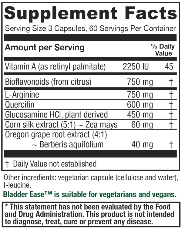 Bladder Ease is a combination supplement designed to nutritionally support those with interstitial cystitis (IC). IC is characterized by chronic pressure and/or pain in the bladder area as well as urinary and frequency. While common urinary tract infections can be treated using antibiotics, IC is not believed to be caused by bacteria. Current medical theories suggest that IC is caused by irritation to the bladder wall caused by increased permeability to urine, and resulting in the release of pro-inflammatory compounds form bladder cells. Ingredients for this formula have been chosen for their ability to help reduce inflammation or to help reduce pain and urgency. Bladder Ease is suitable for vegetarians. Usual dose is 3 capsules, 3 times daily, or as recommended by your physician.