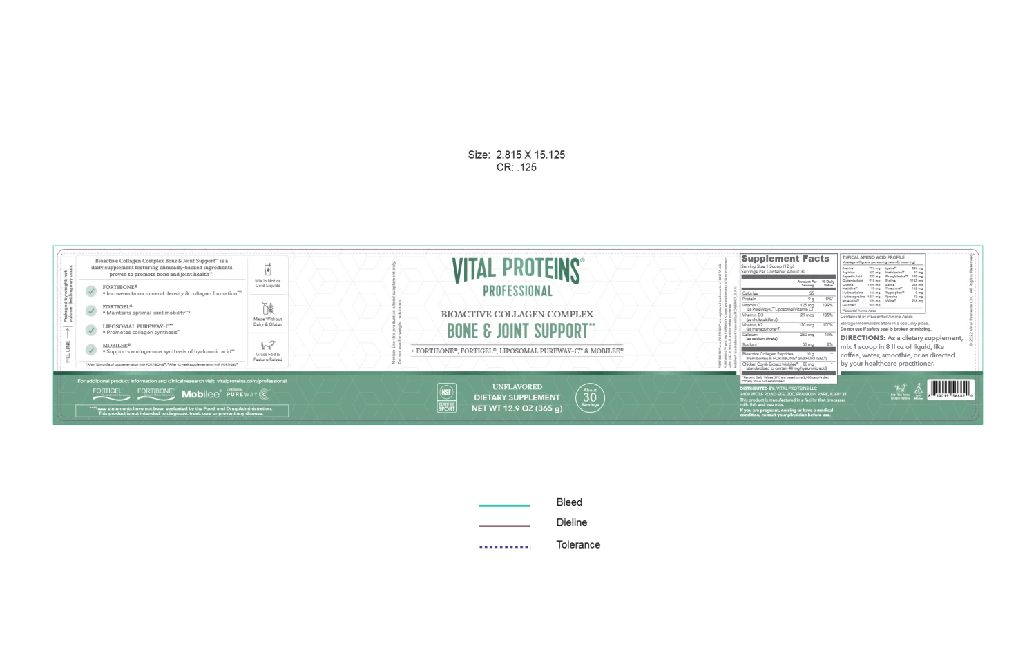 Bioactive Collagen Peptides (from bovine in FORTIBONE® and FORTIGEL®), Calcium (as Calcium Citrate), Vitamin C (as Liposomal PureWay-C™), Chicken Comb Extract Mobilee® (standardized to contain 40mg hyaluronic acid), Vitamin K2 (as menaquinone-7), Vitamin D3 (as cholecalciferol)