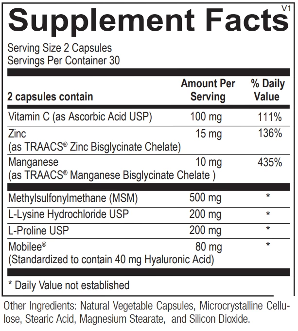 Hyaluronic Acid Extract Mobilee® is a patented, high-molecular-weight hyaluronic acid (HA), which enhances the viscoelastic, lubricating properties of synovial fluid. In addition, it contains collagen and other glycosaminoglycans (GAGs) to enhance skin and joint health. Hyaluronic acid also plays a role in the biophysical, biochemical and cell regulation processes in joint synovial tissues. Scientific evidence shows that Mobilee® supports chondrocytes and synovial cells function, and is two to four times more active than fermented sources of HA in nourishing and supporting the health of synovial fluid. The latest clinical research includes HA in proactive and maintenance approaches to joint care that supports normal range-of-motion. Research suggests that Mobilee® supports the quality of synovial fluid by positively influencing synovial HA concentration, and by reducing the expression of degradative factors in synovial fluid. Specific Precursors Collagen is comprised of and formed from the amino acids proline and lysine. Lysine is an essential amino acid the body relies on adequate dietary intake for its involvement in the synthesis of connective tissues. Proline is well-known for its involvement in the triple helix of collagen—it is regularly spaced with glycine in the amino acid sequence of collagen fiber, which together comprise about 50% of total collagen sequencing. Proline contributes to not only collagen formation, but muscle, tendons and skin. Lysine helps support the linking and stabilization of collagen, and contributes to the collagen matrix formation of veins, arteries and capillaries. During procollagen synthesis, both proline and lysine are hydroxylated to hydroxyproline and hydroxylysine, a reaction requiring vitamin C as a cofactor. Inadequate levels of vitamin C can impact this reaction, resulting in incomplete formation of the helical structure, in which leads to a delicate and easily destroyed structure. Vitamin C is combined with two amino acids—lysine and proline—to form procollagen. Procollagen is then used to manufacture one of several types of collagen found in different tissues throughout the body. Targeted Cofactors Zinc is an essential trace mineral that supports DNA synthesis, cell division, cell membrane structure, immune function, and protein synthesis. Requirements are highest when the body’s repair system is most active. MSM is responsible for the flexible disulfide bonds between cells, including those that make up connective tissue and the skin. It blocks undesirable chemical and physical cross-linking of collagen and preserves connective tissue pliancy, which is crucial for supporting healthy collagen. MSM has been shown to significantly increase plasma glutathione levels, an additional benefit in maintaining collagen’s defensive mechanisms against oxidative stress. Multiple clinical studies also show that MSM, in combination with other joint health ingredients, supports tendon and joint health. Manganese assists the growth and development of normal bone and the synthesis of cartilage. Manganese is also a structural component of antioxidant enzymes, and aids in amino acid production. During the tissue synthesis process, which requires an increased production of collagen, manganese is required for the activation of prolidase, an enzyme that functions to provide the amino acid proline, for collagen formation in human skin cells. Nutritional co-factors required for tissue regeneration include zinc, vitamin C and amino acids. Inadequacy of these nutrients impacts endogenous collagen production and connective tissue synthesis.