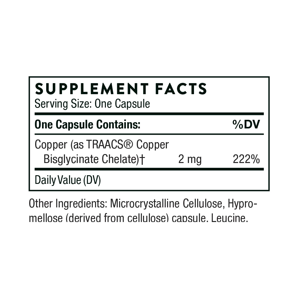 Copper is a trace mineral that is essential for bone health, connective tissue health, cardiovascular health, lipid metabolism, neurological health, and skin health.* It’s also a component of the antioxidant enzyme superoxide dismutase. Because copper and zinc compete with each other for absorption, an individual taking a high amount of zinc (for example, 50 mg daily for an extended time period) can develop a copper deficiency. A copper deficiency can render many cell types, including fat cells and blood cells, more susceptible to oxidation.* For this reason, zinc supplementation should be accompanied by copper supplementation.* In a clinical setting, copper supplementation protected red blood cells from oxidation.* Thorne’s Copper Bisglycinate provides an optimally absorbed form of copper.