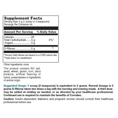 **UPDATE: Out of stock, try these other D-Ribose products. The active ingredient in Corvalen is ribose, a naturally occurring substance used by every cell in your body to synthesize and rebuild energy. It is the critical compound in heart energy recovery and the most fundamental building block of adenine triphosphate (ATP), the primary source of energy for every cell in the body. Without ribose, your heart simply cannot rebuild energy pools that are depleted by heart disease. If you have heart disease, the metabolic machinery in your heart cells do not function efficiently. Working on its own, your heart cannot make ribose fast enough to keep up with your body’s demands and you are always trying to catch up. Your heart is draining energy and becoming literally energy starved. The ribose in Corvalen fuels your heart and the rest of your body with the critical building blocks you need to build energy. And restoring cellular energy means you can feel less tired and can lead a more active life. Healthcare professionals have seen first-hand the dramatic results that Corvalen can produce in their patients every day. It’s no wonder leading cardiac hospitals and clinics around the country are recommending Corvalen to their patients with heart disease. Usual dose is 1 scoop taken two times daily, or as recommended by your physician.