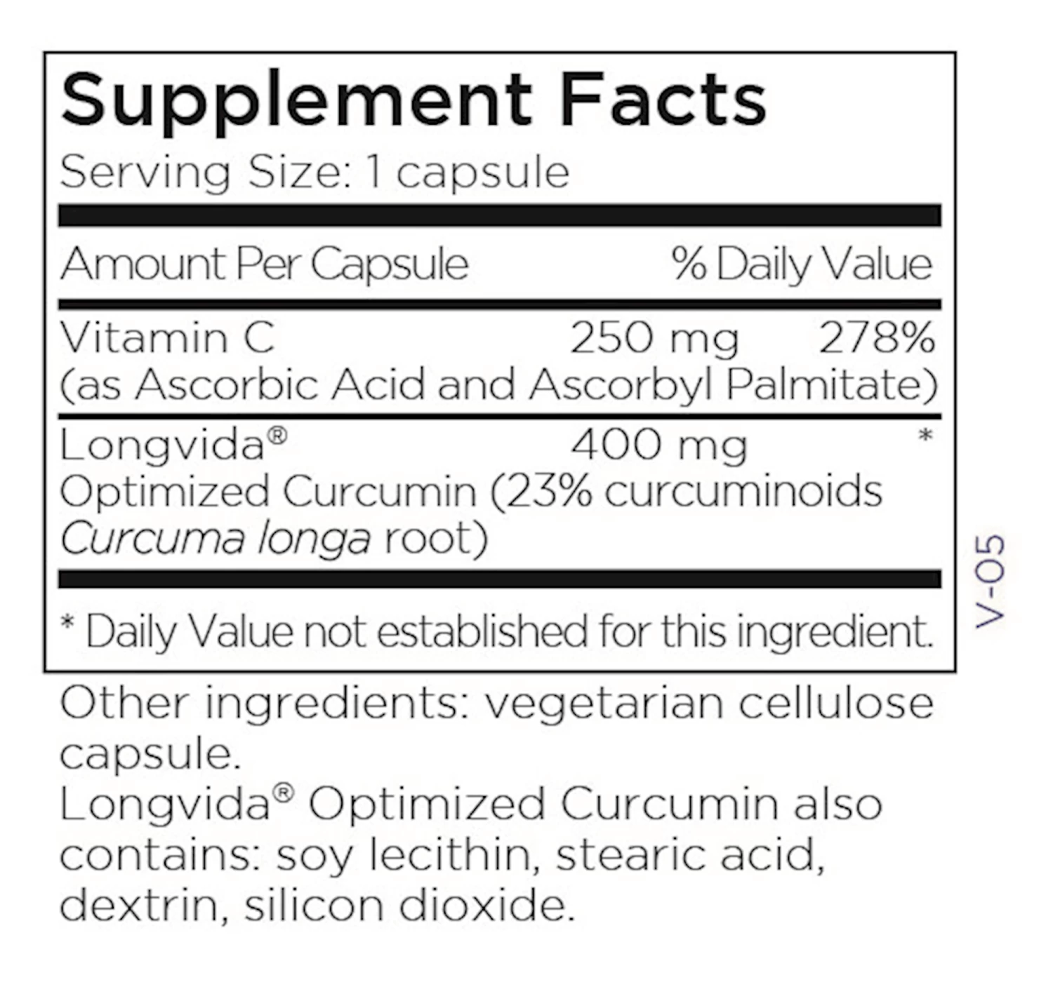 Source Materials: Curcumin is extracted from turmeric root. Ascorbic acid is from corn sorbitol. Ascorbyl palmitate is from ascorbic acid and palm oil. The patented Longvida® Solid-Lipid Curcumin Particle also contains lecithin from soy, stearic acid from palm oil, maltodextrin from potato, silicon dioxide from mined quartz. Allergens: According to information provided by our suppliers, these capsules are free of the eight major allergens as identified by the Food Allergen Labeling and Consumer Protection Act of 2004 (FALCPA): Wheat (gluten), eggs, milk, soybeans, shellfish, fish, peanuts, tree nuts. Recommendations: One to two (1-2) capsules daily with a meal, or as directed by a healthcare professional. Precautions: Pregnant or lactating women and individuals taking prescription medications should consult with a healthcare professional before taking any supplement.
