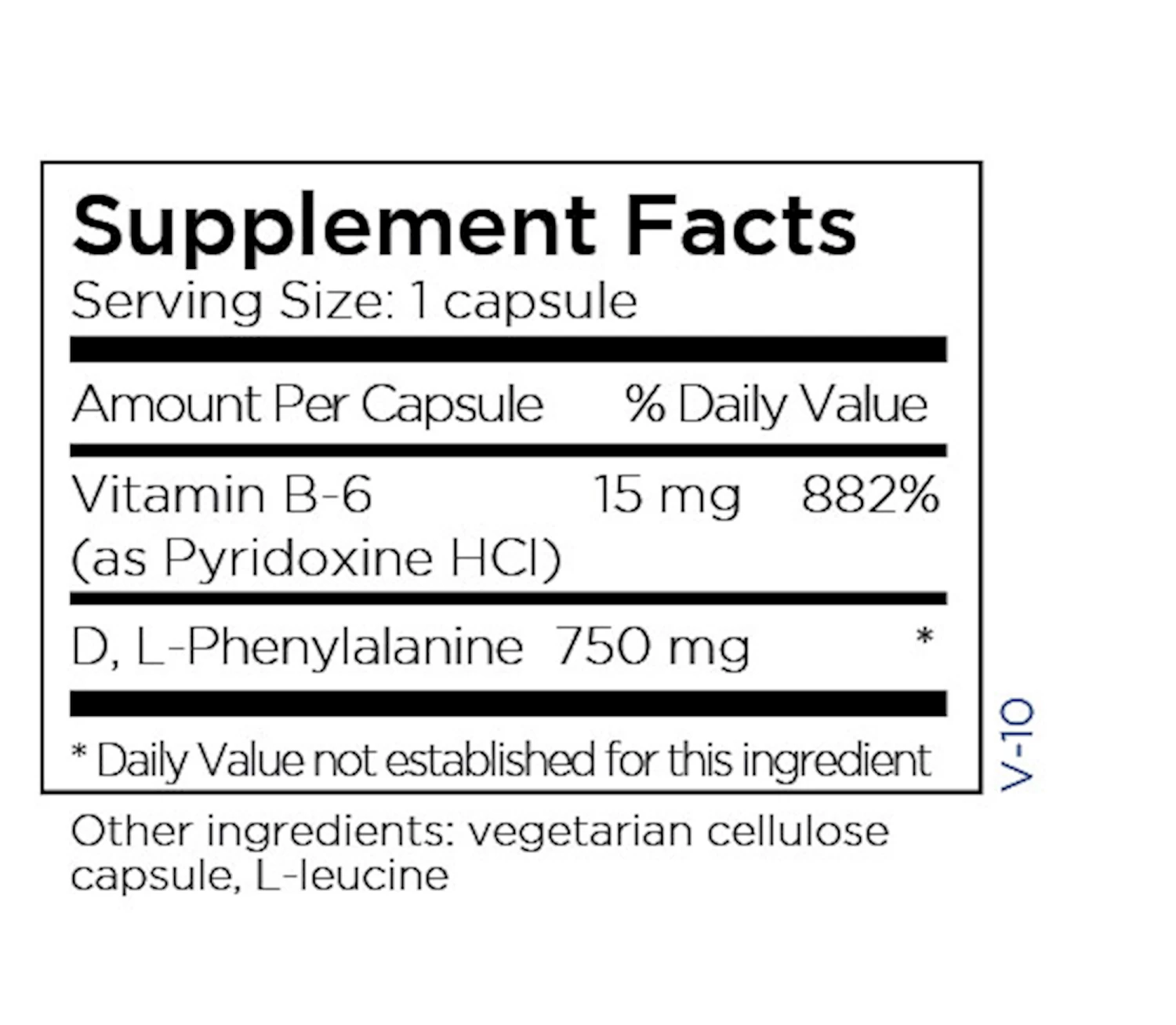 Source Materials: D, L-Phenylalanine is synthesized from L-phenylalanine (from fermentation) and acetic acid. Pyridoxine HCl is synthetic. L-leucine is made by fermentation. Cellulose for capsules is derived from softwood tree pulp. All ingredients are vegan and non-GMO. Allergens: According to information provided by our suppliers, these capsules are free of the eight major allergens as identified by the Food Allergen Labeling and Consumer Protection Act of 2004 (FALCPA): Wheat (gluten), eggs, milk, soybeans, fish, shellfish, peanuts, tree nuts. Recommendations: Use as directed by a healthcare professional. Precautions: Pregnant or lactating women and individuals taking prescription medications should consult with a healthcare professional before taking any supplement.