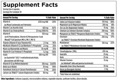 DFH Complete Multi™ is a full-spectrum multivitamin with Albion chelated minerals for maximum absorption and bioavailability. This powerhouse multivitamin supplies supportive nutrients not normally found in regular multis, such as delta and gamma tocotrienols, TMG, and fruit bioflavanoids. This formula also contains, natural mixed carotenoids, a full spectrum of vitamin K forms, and levels of B vitamins based on evolutionary intake of these nutrients, which support healthy cell replication and are higher than RDA/RDI values. This copper and iron-free version is appropriate for men and postmenopausal women.** Recommended Use: As a dietary supplement, take four capsules per day, with meals, or as directed by your healthcare practitioner (divided dosing recommended).