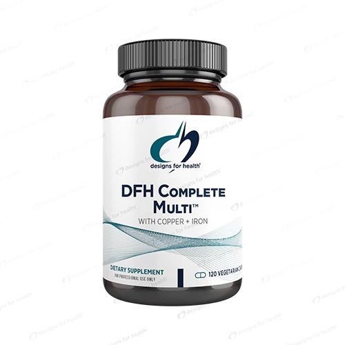 DFH Complete Multi™ with Copper and Iron is a full-spectrum multivitamin with Albion chelated minerals for maximum absorption and bioavailability. This powerhouse multivitamin supplies supportive nutrients not normally found in regular multis, such as delta and gamma tocotrienols, TMG, and fruit bioflavanoids. This formula also contains, natural mixed carotenoids, a full spectrum of vitamin K forms, and levels of B vitamins based on evolutionary intake of these nutrients, which support healthy cell replication and are higher than RDA/RDI values. This formula is appropriate for teenagers, menstruating females, lactating women and those who avoid eating red meat.** Recommended Use: As a dietary supplement, take six capsules per day with meals, or as directed by your healthcare practitioner (divided dosing recommended).