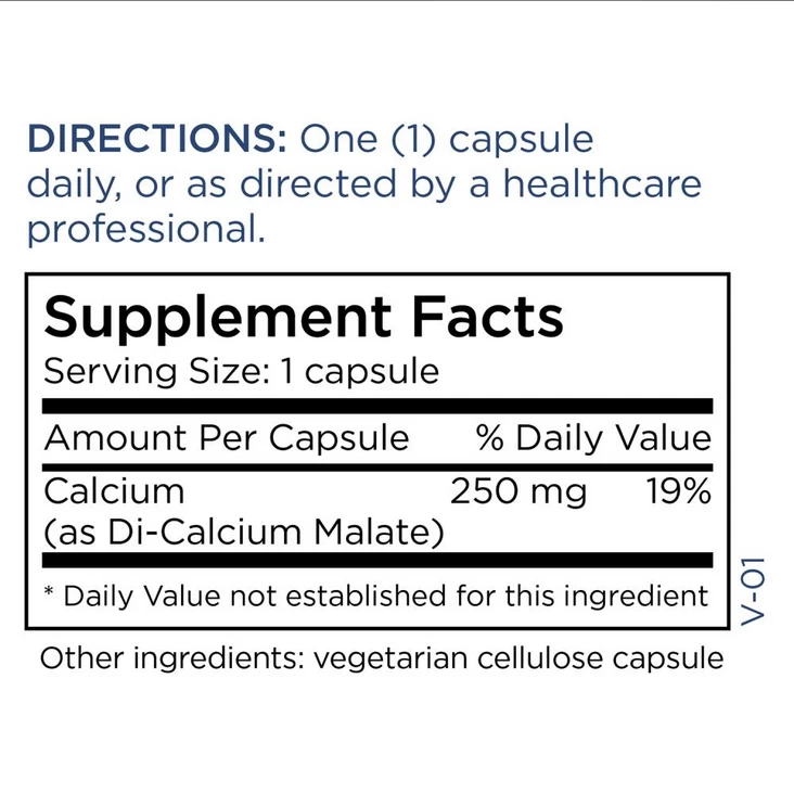 Description: Our standalone calcium product now features an ingredient designed to make getting optimal amounts of this important bone health mineral easier. Di-calcium malate is easily absorbed and according to research, keeps calcium circulating in the body longer than other forms of supplemental calcium. Because the dicalcium form provides two molecules of elemental calcium, it is more concentrated than forms like calcium citrate, meaning fewer capsules a day to provide optimal supplementation.