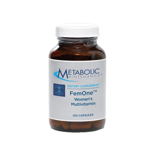 What is FemOne? It is a high-potency, one-per-day multivitamin/mineral capsule designed specifically for the needs of women during their childbearing years. As a base for your nutritional support regimen, it can also be combined with any Metabolic Maintenance calcium and magnesium formula to fit your individual needs. Depending on individual requirements, additional antioxidants, amino acids, CoQ10, probiotics, and/or Omega 3s can also be added to the supplement regimen. How Does FemOne Work? FemOne™ provides essential vitamins and trace minerals to support general good health, including reproductive and immune health. Iron is a component of blood hemoglobin, critical for oxygen transport, and myoglobin, the oxygen carrier in muscles. Inorganic iron supplements such as iron sulfate are poorly absorbed and can cause gastric distress. FemOne contains Ferrochel® chelated iron bis-glycinate (Albion Minerals) for superior absorption, tolerance, and safety. Folate has long been recognized as important for reproductive health. About half of the population has inherited genetic variations that slow or prevent the enzymatic conversion of folic acid (the form of folate found in most daily multivitamin/mineral formulas) to the form the body uses, L-methylfolate. FemOne contains Quatrefolic, the most bioavailable form of L-methylfolate. L-methylfolate is critical in almost every single cell for methylation reactions, including DNA synthesis, cell division, amino acid metabolism, and neurotransmitter synthesis. Although vitamin D can be made by the skin with exposure to sunlight, use of sunblock, indoor lifestyles, and living at northern latitudes result in the majority of the population having low serum vitamin D levels. Recent research indicates that low serum vitamin D is linked to many autoimmune and neurodegenerative disorders and a higher level of supplementation is recommended. FemOne also contains a highly bioavailable, methylated form of vitamin B-12 (methylcobalamin), phosphorylated forms of riboflavin and B-6, chelated trace minerals, natural mixed carotenoids, and natural vitamin E. What is the Suggested Use for FemOne? FemOne is suggested for women, post menarche and pre-menopause, as a once-daily capsule to support general health systems. Together, the nutrients in FemOne support:
