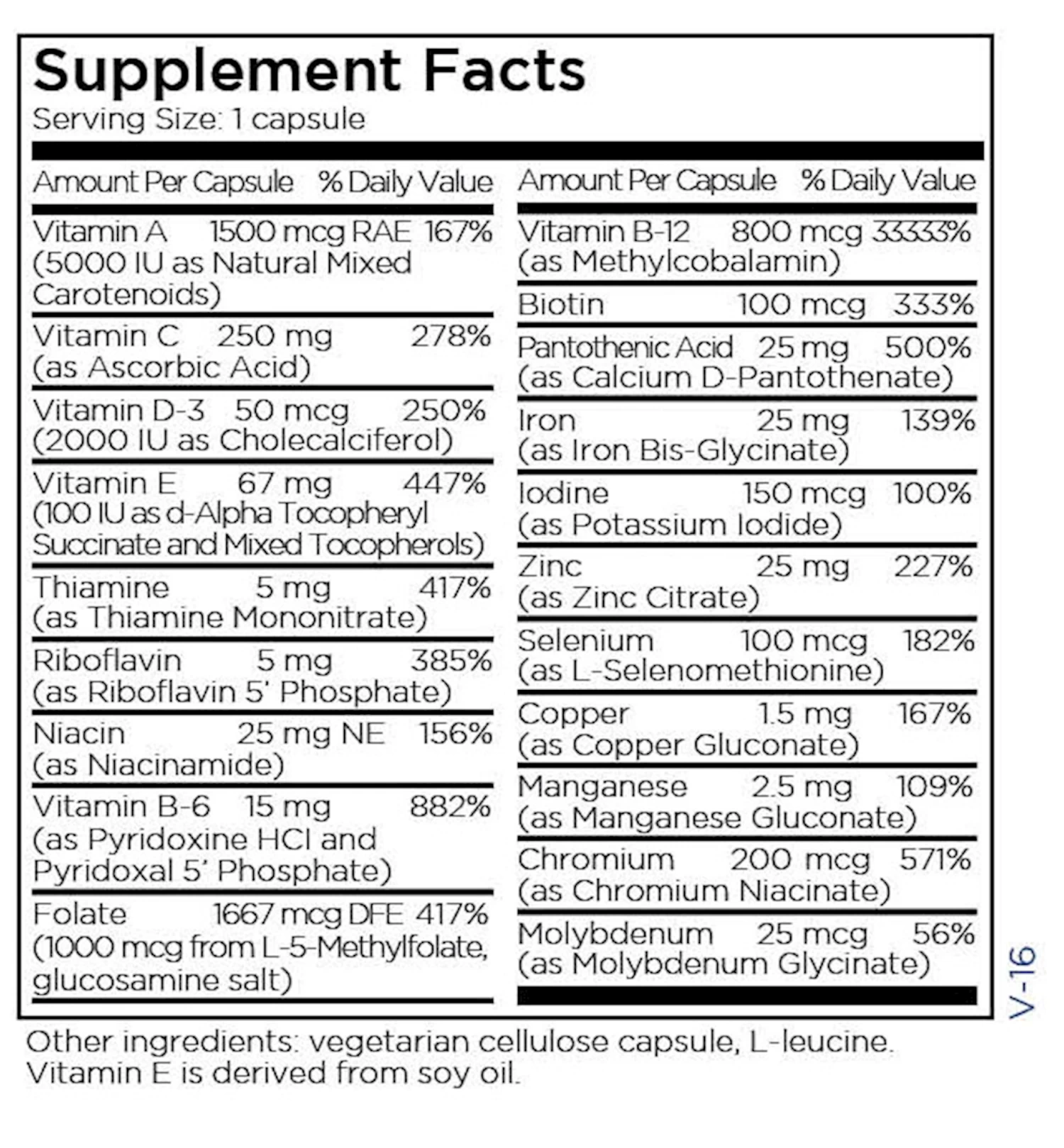 Source Materials: Thiamine mononitrate, niacinamide, pyridoxine HCl, pyridoxal 5 phosphate, L-methylfolate, biotin, and pantothenic acid: synthetic. Natural mixed carotenoids: carrot and marigold extracts. Ascorbic acid: corn sorbitol. Vitamin D3: lanolin from sheep’s wool. Vitamin E succinate and mixed tocopherols: purified soy oil. Riboflavin 5 phosphate and methylcobalamin: dextrose fermentation. Minerals are mined. Chelating agents include: glycine (synthetic), citric acid (corn fermentation), methionine (synthetic), glucuronic acid (synthetic). L-leucine is derived by sugar fermentation. Cellulose for capsules is derived from softwood tree pulp. There is no detectable GM material present. Allergens: According to information provided by our suppliers, these capsules are free of the eight major allergens as identified by the Food Allergen Labeling and Consumer Protection Act of 2004 (FALCPA): Wheat (gluten), eggs, milk, soybeans, shellfish, fish, peanuts, tree nuts. Recommendations: One (1) capsule daily with a meal, or as directed by a healthcare professional. Precautions: Pregnant or lactating women and individuals taking prescription medications should consult with a healthcare professional before taking any supplement. Accidental overdose of iron-containing products is a leading cause of fatal poisoning in children under 6. Keep this product out of the reach of children. In case of an accidental overdose, call a doctor or poison control center immediately.