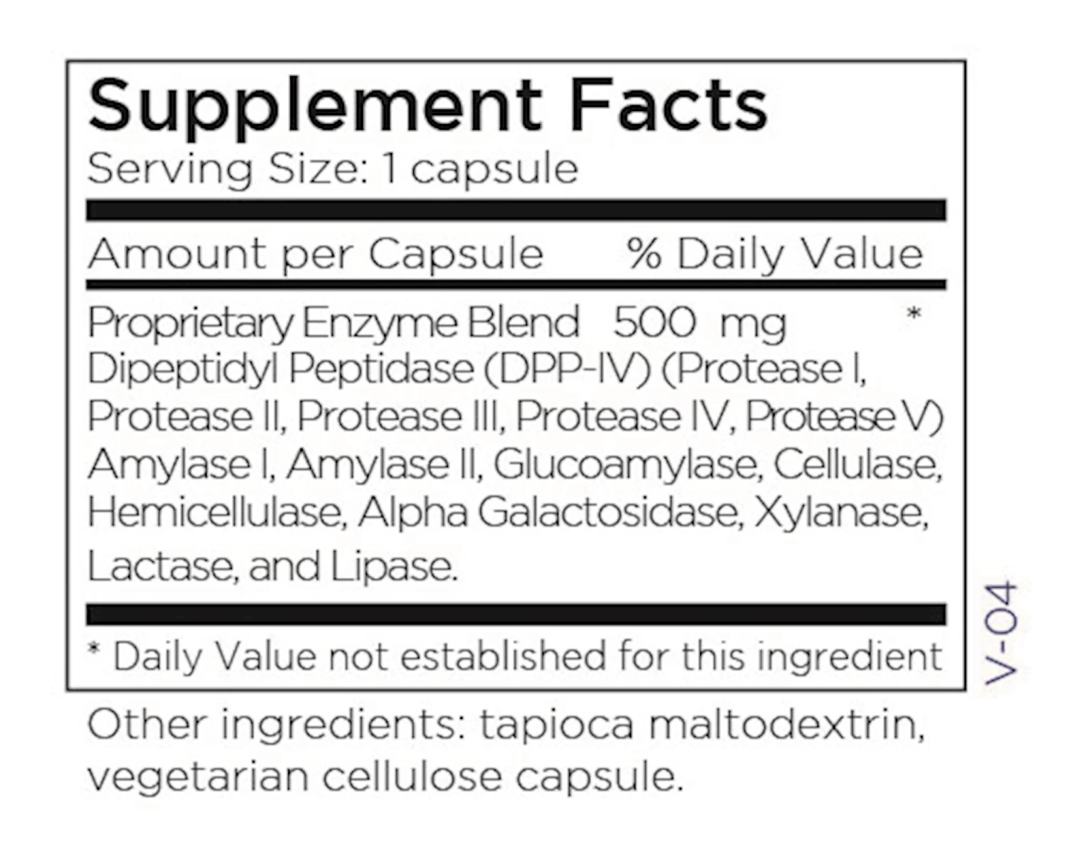 What is GluDaZyme™? GluDaZyme™ contains a proprietary dipeptidyl peptidase IV (DPP-IV) enzyme blend that aids in the breakdown of gluten, casein, complex carbohydrates, sugars, lactose, and fats. Aside from supporting healthy digestion processes and normal response to gluten and casein peptides, GluDaZyme™ also aids in normal digestion for those with severe food sensitivities and can help to mitigate repercussions of cross-contact. How does GluDaZyme™ Work? The process of eating any food will provoke the secretion of multiple gastrointestinal hormones involved in the regulation of gut motility, secretion of gastric acid and pancreatic enzymes, gallbladder contraction, and nutrient absorption [1]. Some conditions, such as dairy and gluten intolerance, are characterized by insufficient production of particular digestive enzymes, such as lactase or DPP-IV. Supplementing some of these enzymes may optimize digestion by breaking down food particles the food-sensitive body is normally under-equipped to do, thereby enhancing nutrient availability. Dipeptidyl peptidase IV (DPP-IV) is a unique multifunctional type II transmembrane glycoprotein that acts as a receptor, binding protein, and proteolytic enzyme. DPP-IV is widely distributed in mammalian tissues, and a high level of DPP-IV activity is found in the intestinal walls [2]. DPP-IV has shown specific action in the breakdown of gluten, among other proteins [3]. Proteases, also known as proteolytic enzymes, peptidase or proteinase are secreted naturally by the gut to breakdown dietary protein into smaller, absorbable peptides or amino acids [4]. They also break down unwanted bacteria, toxins, and cellular debris, complementing and relieving some roles of the immune system [4]. Amylase is produced naturally by salivary glands in the human body [5]. It is one of the most abundant salivary proteins and plays numerous roles in digestion, including hydrolyzing larger starch molecules into glucose and maltose for cellular transport and energy metabolism [5]. Glucoamylase, specifically, allows breaks down starch into d-glucose [6]. Some types of dietary fiber, such as insoluble plant polysaccharides (mainly cellulose and hemicelluloses; representing 20–30% of the dietary fiber ingested daily) cannot be broken down by human enzymes. However, probiotic bacteria (the microorganisms living in a healthy gut) produce some cellulase and hemicellulase, enzymes that break down these cell wall proteins to release valuable, absorbable nutrients from dietary plant material [7]. Supplementing cellulase and hemicellulase may aid in this process. Alpha galactosidase is a naturally occurring human lysosomal glycosidase responsible for the hydrolysis of terminal a-galactosidic linkages in various glycolipids [8]. Xylanases are glycosidases not produced naturally by human cells but are also secreted by beneficial microorganisms in a healthy human gut [9]. Both glycosidases also aid in cellular breakdown and are especially beneficial to human digestion of plant material. Lactose is the natural disaccharide sugar found in milk and dairy products, but the absorption of lactose requires enzymatic lactase activity in the small intestinal brush border [10]. Lactose malabsorption is the incomplete hydrolysis of lactose due to lactase deficiency, which may occur as a primary disorder or secondary to other intestinal diseases, and becomes an increasingly common condition with age, as lactase production by the gut tends to decline over time [10]. Supplementing lactase may aid in the digestion of dairy and ease the discomfort that often accompanies malabsorption. Human lipases are secreted most abundantly by the stomach and the pancreas to aid in the digestion and assimilation of dietary fats [11]. Hepatic, lipoprotein and endothelial lipases are also secreted for the metabolism of lipoproteins [11]. Supplementation of these highly hydrophobic enzymes may aid in the digestion of dietary fats, and the absorption of valuable nutrients that are otherwise sequestered by lipid globules. What are the Suggested Uses for GluDaZyme™? Designed specifically to help those sensitive to gluten and dairy, GluDaZyme™ is suggested for those who may want to: