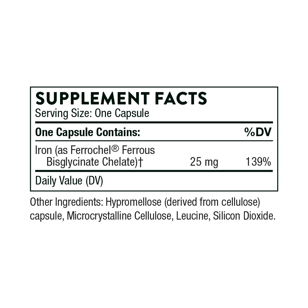 Thorne’s Iron Bisgylcinate is NSF Certified for Sport®. It is essential for the formation of red blood cells.* The U.S. Centers for Disease Control has determined that the prevalence of iron deficiency is greatest among toddlers (7% of those ages 1-2 years) and menstruating adolescent and adult females (9-16 % of individuals ages 12-49, whether they are athletes or not. Conventional iron supplementation, including forms such as ferrous sulfate, can cause gastrointestinal side effects – including nausea, vomiting, constipation, diarrhea, and dark-colored stools – because these conventional forms of iron are poorly absorbed. Thorne’s Iron Bisglycinate provides 25 mg of elemental iron per capsule that has been reacted with glycine for optimal absorption in the gastrointestinal tract, thus helping to decrease the typical gastrointestinal side effects.* An iron deficiency can manifest as weakness, fatigue, shortness of breath on exertion, dizziness, tinnitus, spots before the eyes, drowsiness, irritability, infrequent menstruation, and loss of libido.* Athletes need approximately 1.5 times as much Iron as non-athletes. Those who follow a vegetarian or lower protein diets may have needs as high as 1.8 times as much dietary iron. Blood loss from injury and muscle damage, as well as GI bleeding associated with extreme endurance activities can further decrease the body’s iron stores. Low iron can lead to a reduction in the body’s normal uptake of oxygen to cells. A reduction of oxygen to cells can lead to a reduction in work capacity and aerobic performance. Untreated chronic low levels of iron can lead to iron deficient anemia. Because an athlete needs to know that his or her supplements are trustworthy and compliant, every batch of an NSF Certified for Sport® product is tested for compliance with label claims and to ensure the absence of more than 200 substances banned by many major athletic organizations, including stimulants, narcotics, steroids, diuretics, beta-2 agonists, and masking agents.