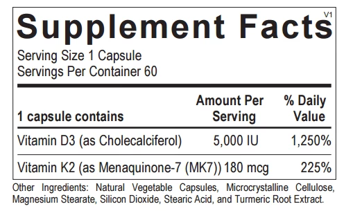 Emerging research highlights the importance of optimal intake of vitamin K and its critical role in maintaining bone and cardiovascular health. Composed of a group of naturally occurring and structurally similar, fat-soluble vitamins, vitamin K is required for the proper utilization of calcium and helps to bind newly absorbed calcium to the bone matrix. Vitamin K helps maintain bone mineral density by decreasing the activity of osteoclasts, cells which break down bone. It also provides critical cardiovascular protection by activating matrix Gla protein (MGP), a potent inhibitor of circulatory calcification. Along with vitamin D, another key nutrient required for overall wellness, these two nutrients act in synergy to support and maintain bone and cardiovascular health. Current research has found high concentration supplementation, at 180 μg/day, results in improved clinical results compared to lower-dose supplementation. K-FORCE provides 180 mcg of MenaQ7® PRO, the most widely studied form of vitamin K2 as MK-7, along with 5,000 IU of vitamin D3 for optimal support of bone and cardiovascular health. Suggested Use: 1 capsule per day or as recommended by your health care professional