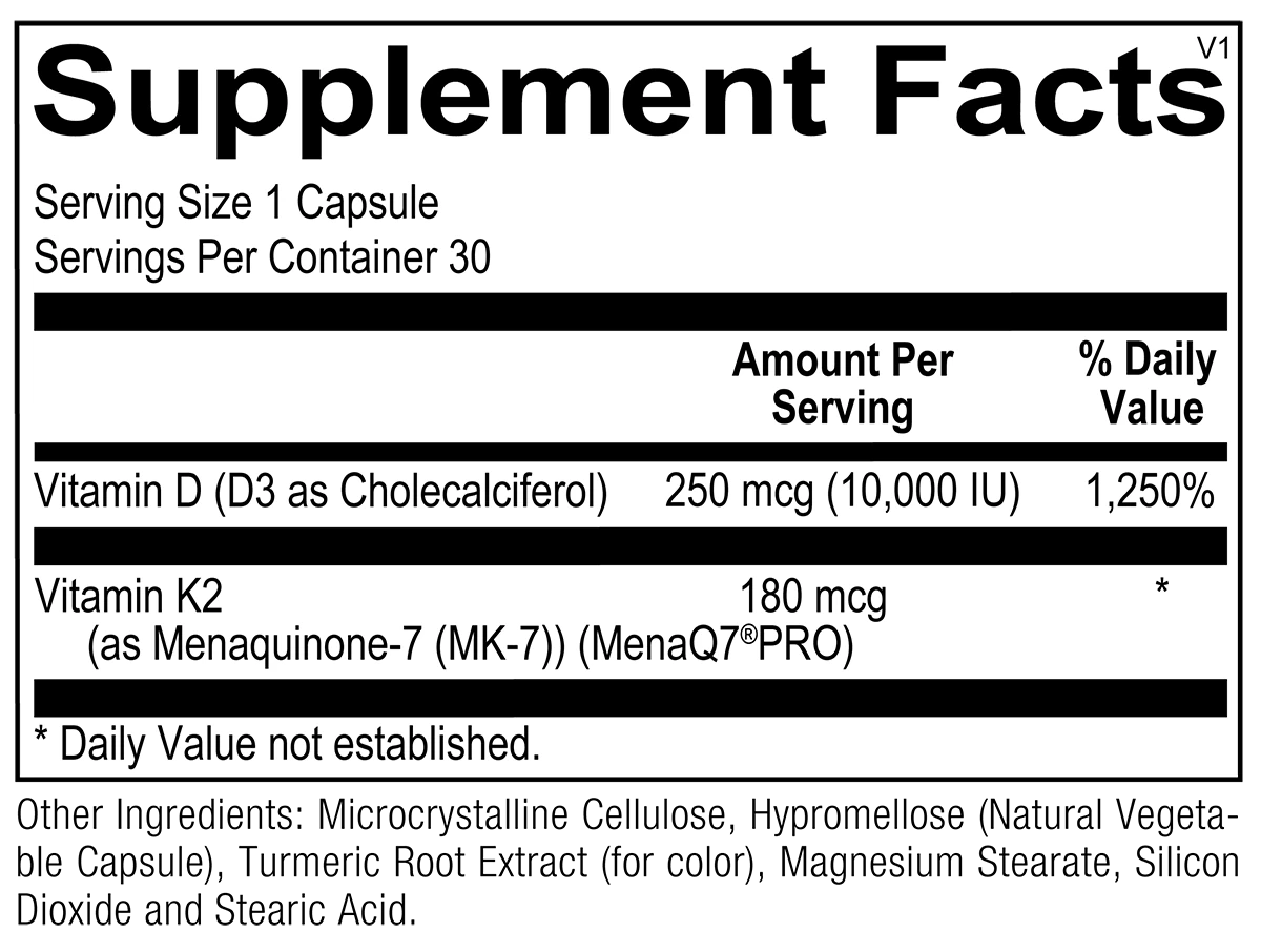 K-FORCE MAX provides 180 mcg of MenaQ7® PRO, the most widely studied form of vitamin K2 as MK-7, along with 10,000 IU of vitamin D3 for optimal support of bone and cardiovascular health.