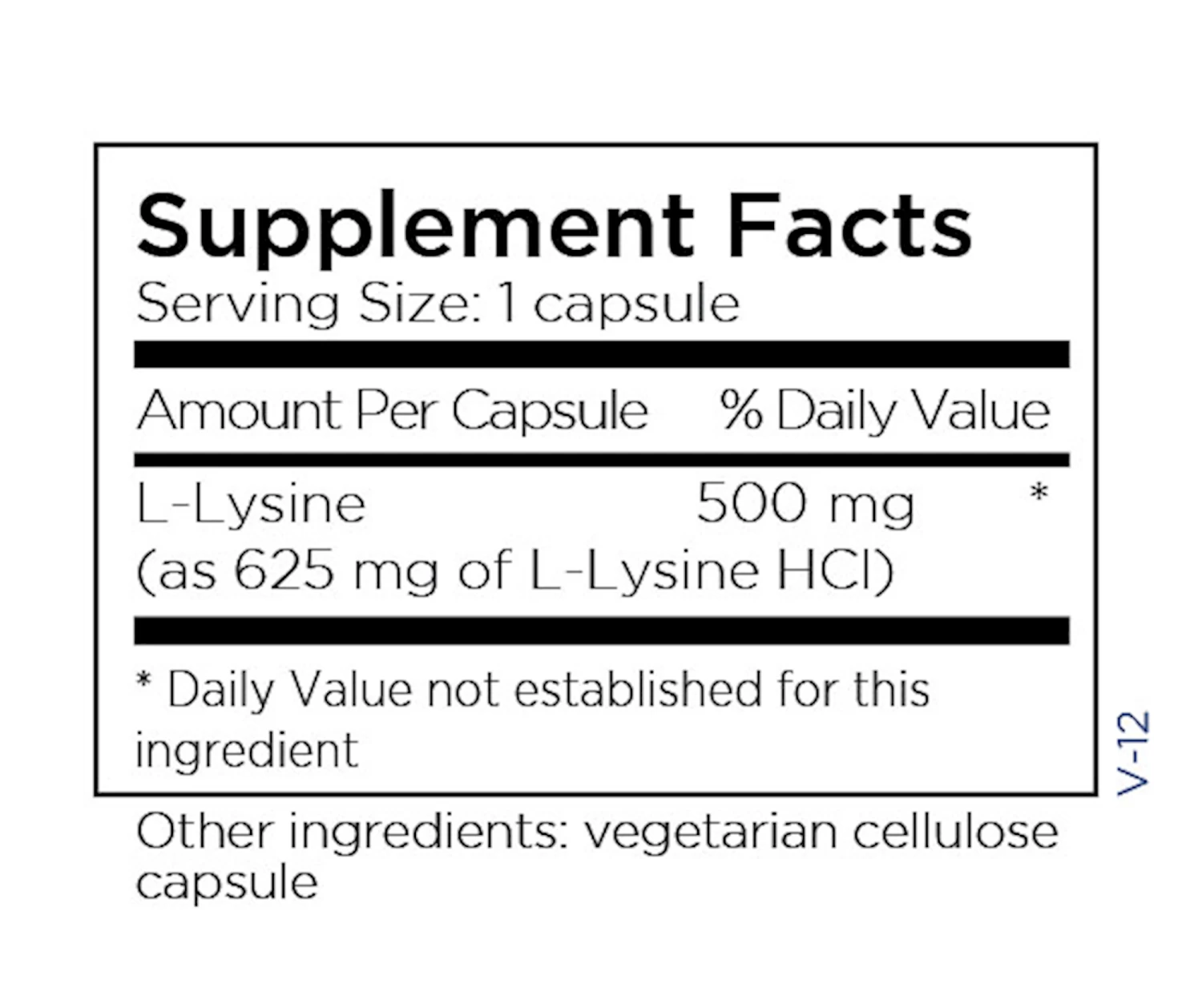 Source Materials: L-lysine: fermentation. Cellulose for capsules is derived from softwood tree pulp. All ingredients are vegan and non-GMO. Allergens: According to information provided by our suppliers, these capsules are free of the eight major allergens as identified by the Food Allergen Labeling and Consumer Protection Act of 2004 (FALCPA): Wheat (gluten), eggs, milk, soybeans, shellfish, fish, peanuts, tree nuts. Recommendations: Use as directed by a healthcare professional. Most effective when taken between meals. Precautions: Pregnant or lactating women and individuals taking prescription medications should consult with a healthcare professional before taking any supplement.