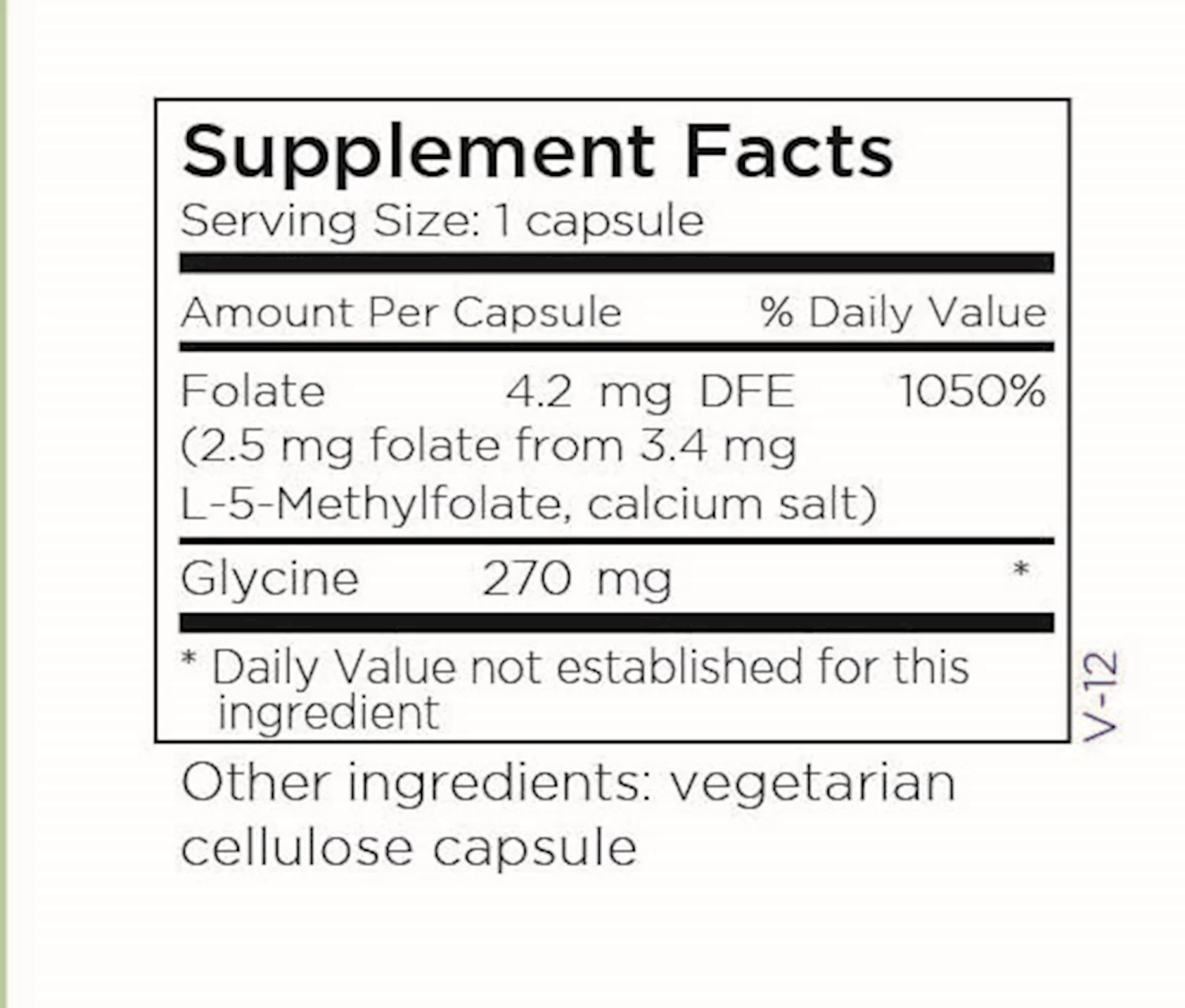Source Materials: L-methylfolate, calcium salt (Extrafolate S®, Gnosis Bio, Italy) and glycine are made by chemical synthesis. All ingredients are vegan and non-GMO. Allergens: According to information provided by our suppliers, these capsules are free of the eight major allergens as identified by the Food Allergen Labeling and Consumer Protection Act of 2004 (FALCPA): Wheat (gluten), eggs, milk, soybeans, shellfish, fish, peanuts, tree nuts. Recommendations: Use as directed by a healthcare professional. Precautions: Pregnant or lactating women and individuals taking prescription medications should consult with a healthcare professional before taking any supplement.