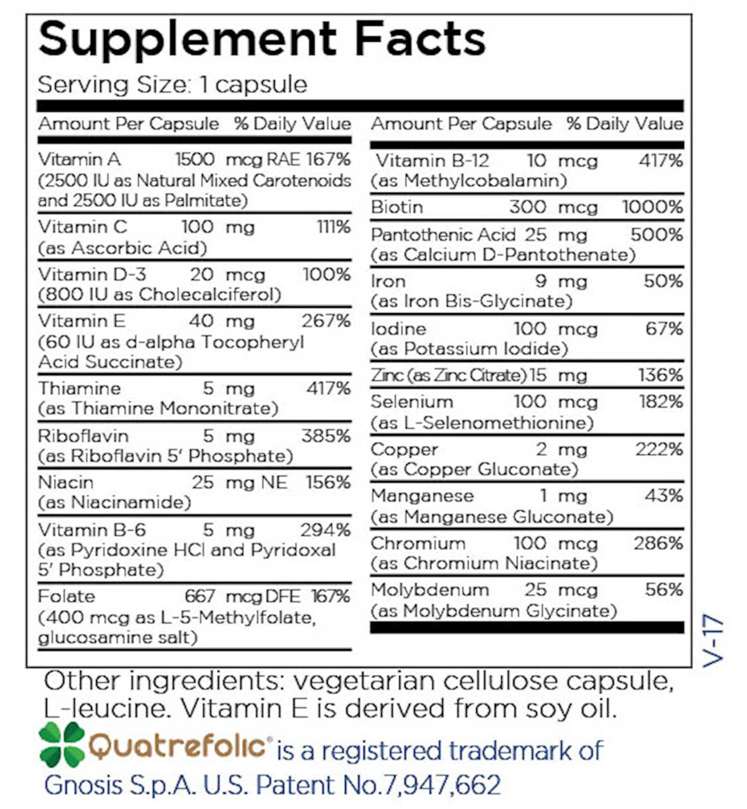 Source Materials: Vitamin A palmitate, thiamine mononitrate, niacinamide, pyridoxine HCl, pyridoxal 5 phosphate, L-methylfolate, biotin, and pantothenic acid: synthetic. Natural mixed carotenoids: carrot and marigold extracts. Ascorbic acid: corn sorbitol. Vitamin D3: lanolin from sheep’s wool. Vitamin E succinate: purified soy oil. Riboflavin 5 phosphate and methylcobalamin: dextrose fermentation. Mineral are mined. Chelating agents include: glycine (synthetic), citric acid (corn fermentation), methionine (synthetic), glucuronic acid (synthetic). L-leucine: fermentation. Cellulose for capsules is derived from softwood tree pulp. Allergens: According to information provided by our suppliers, these capsules are free of the eight major allergens as identified by the Food Allergen Labeling and Consumer Protection Act of 2004 (FALCPA): Wheat (gluten), eggs, milk, soybeans, shellfish, fish, peanuts, tree nuts. Recommendations: Use as directed by a healthcare professional. Precautions: Pregnant or lactating women and individuals taking prescription medications should consult with a healthcare professional before taking any supplement.