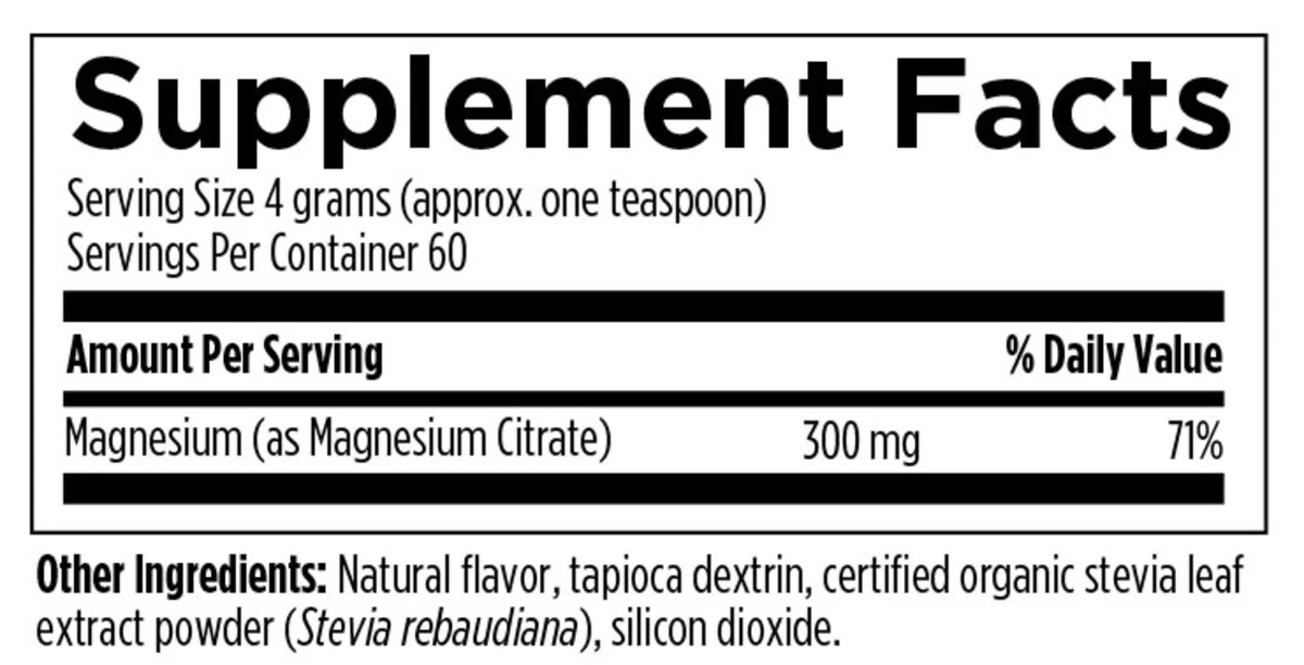 MagCitrate Powder provides 300 mg of magnesium in each one teaspoon serving – a convenient delivery system in a great-tasting lemon flavored powder. It mixes well in water and is very easy to titrate when higher doses are needed. MagCitrate Powder helps promote bowel relaxation when fiber alone is not enough. This product also supports the ability to fall asleep, and can be taken along with our Inositol Powder for a restful night’s sleep.** Recommended Use: As a dietary supplement, take 4 grams (approx. one teaspoon) per day, or as directed by your health care practitioner.