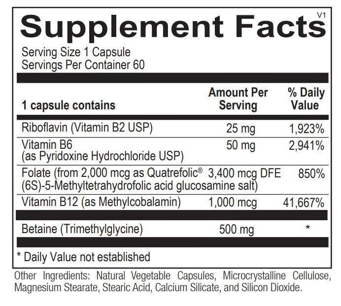 Folate Folate is a water soluble member of the B complex vitamins that is critical for maintaining optimal methylation. Folate is abundantly found in foods such as fruits and dark leafy vegetables but, can be easily destroyed by cooking or processing. The bioactive form of folate is 5-methyltetrahydrofolate (5-MTHF). 5-MTHF is required as a methyl group donor for several processes, including the production of mood regulating neurotransmitters, the synthesis of melatonin, and DNA production and repair. Vitamin B12 Vitamin B12 works with folate in many body processes, including the synthesis of DNA, red blood cells and supporting health of the myelin sheath, the insulating exterior that surrounds nerve cells. B12 is found primarily in animal foods. Vegetarians and the elderly run the highest risk of B12 deficiency. Methylcobalamin is the preferred form of B12, as it is the biologically active form of B12 and supports the up-regulation of methylation pathways. Vitamin B6 Vitamin B6 is a crucial B vitamin that is involved in the production of proteins in the body, neurotransmitters that help regulate mood, red blood cell formation and the proper functioning of the immune system. B6 is required for more than 60 different enzymatic reactions that occur in the body. Vitamin B6 works along with 5-MTHF and B12 in the recycling of homocysteine. B6 also supports a healthy cardiovascular system by promoting healthy platelet aggregation and aids in maintaining normal blood pressure. Vitamin B2 Optimizing B2 status helps support healthy blood pressure, particularly in patients with genetic mutations (MTHFR 677 > T polymorphism). Betaine (Trimethylglycine) As a methyl donor, trimethylglycine supports liver function, including detoxification pathways. Trimethylglycine has been shown to be beneficial in protecting against fat accumulation in the liver, due to its lipotropic properties (donating a methyl group to aid in the transport of fat out of the liver). Trimethylglycine also works alongside B2, B6, B12 and folate in maintaining normal homocysteine levels.