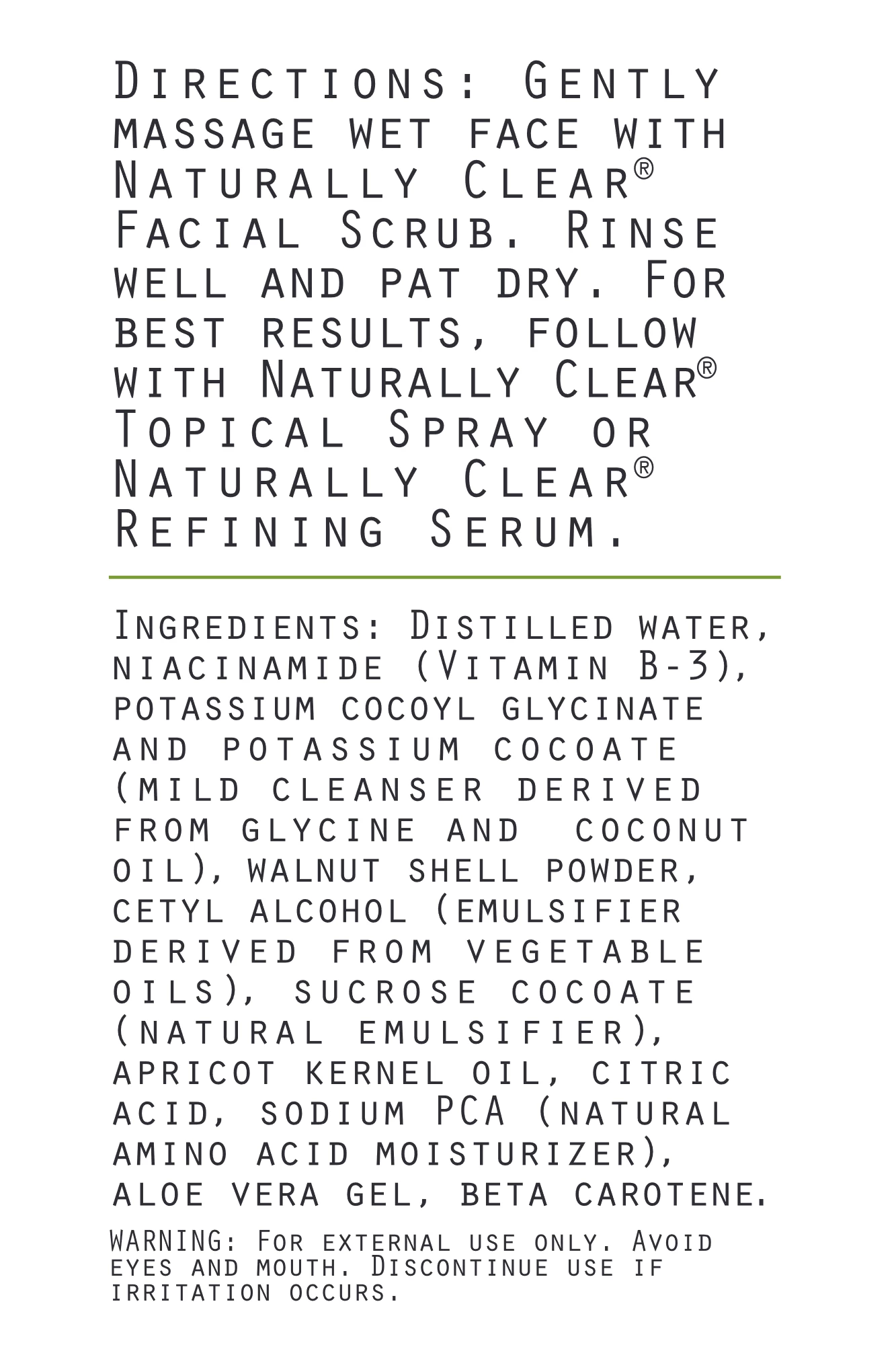 Description: This facial scrub contains niacinamide, aloe vera, a mild cleanser, apricot kernel oil, and powdered walnut shells. Exfoliating facial skin has been shown to increase blood circulation, break down surface toxins, and encourage the production of new skin cells. The ingredients of the Facial Scrub work together to cleanse, moisturize, and exfoliate facial skin. Uses: Niacinamide, also known as nicotinamide or 3-pyridinecarboxamide, is the physiologically active form of niacin or vitamin B3. There is clinical evidence that niacinamide is an anti-acne active as it reduces the production of sebum (the pore-clogging, oily substance secreted by the skin), making it effective in alleviating symptoms of mild to moderate acne [1]. It is also an up-regulator of epidermal sphingolipid synthesis, an up-regulator of markers of epidermal differentiation and dermal proliferation, as well as a moderator of photodamage repair [1]. Cosmetically, topical niacinamide has been shown to help reduce yellowing, wrinkling, redness, blotchiness, and hyperpigmentation in facial skin [2]. Topical niacinamide also provides potent anti-inflammatory activity. Skin cell studies suggest niacinamide may stimulate collagen production (a benefit associated with anti-aging effects) and facilitate wound healing [1]. The humectant Na-PCA, or sodium pyrrolidone carboxylic acid, is an amino acid moisturizer naturally occurring in the stratum corneum of human skin [3]. Younger skin contains more Na-PCA than aging skin [3]. Na-PCA is added to Naturally Clear® products to help the skin retain moisture, prevent dryness and flaking, and give skin a youthful glow. Aloe vera is a popular ingredient in skin care products because of its well-known skin soothing, anti-fungal, and anti-inflammatory properties [4]. In fact, records from Greece, Egypt, India, Mexico, Japan and China show that medicinal plants of the aloe genus have been used for over 2000 years to soothe many symptoms of skin disease [4,5]. Studies have shown topical aloe vera to be effective in healing minor skin infections, making scarring less likely [5]. It contains six antiseptic agents: Lupeol, salicylic acid, urea nitrogen, cinnamonic acid, phenols and sulfur, all of which have an inhibitory effect on fungi, bacteria and viruses [5]. Aloe vera has been demonstrated to protect skin from reactions to and damage caused by radiation (due to UV/sun exposure as well as therapeutic radiation) [5,6]. Giberellin, a component of aloe vera, also acts as a growth hormone, stimulating the growth of new cells [7]. Aloe vera also improves skin’s hydration and elasticity while providing a refreshing sensation. Apricot kernel oil, Prunus armeniaca L., has naturally occurring antimicrobial, antibacterial, and antioxidant properties and has been well-researched as a skin conditioning agent that is emollient, non-greasy and ideal for dry, tired or mature skin [8, 9]. Walnut shell powder is an all natural exfoliant made from ground walnut husks. This exfoliant is hypoallergenic and gentle, as massage will aid in the removal of dead skins cells without scratching or damaging healthy skin tissue [10, 11]. Source Materials: Niacinamide: chemical synthesis. Potassium cocoyl glycinate and potassium cocoate: mild cleanser derived from glycine and coconut oil. Walnut shell powder: Juglans regia ground shells. Cetyl alcohol: vegetable oils. Sucrose cocoate: sugar beets and coconut oil. Apricot kernel oil: cold-pressed from dried apricot seeds. Citric acid: fermentation of glucose. Aloe vera: Aloe barbadensis inner leaf fillet juice. Sodium PCA: derived from the amino acid proline. Beta carotene: synthetic. Allergens: This formula contains walnut shell powder and coconut. Free from: wheat (gluten), eggs, milk, soybeans, shellfish, fish, and peanuts. All ingredients are vegan. Never tested on animals. Recommendations: Gently massage wet face with Naturally Clear® Facial Scrub. Rinse well and pat dry. For best results, follow with Naturally Clear® Topical Spray or Naturally Clear® Restoring Serum.
