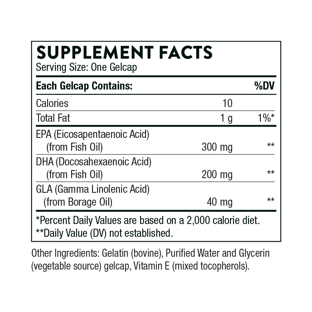 On average, Americans don’t eat enough fish. The typical diet contains significantly more omega-6 fatty acids than omega-3 fatty acids. Thus, Omega Plus provides a balanced ratio of omega-3 and omega-6 essential fatty acids.* Most people know that omega-3 fatty acids have significant health benefits. But Thorne’s Omega Plus also contains the omega-6 fatty acid – gamma linolenic acid (GLA) – which offers similar benefits.* Studies have found positive benefits from a combination of omega-3 fatty acids and GLA for bone health, as well as for the cardiovascular and respiratory systems.* Studies have also determined that a combination of GLA with EPA and DHA helps maintain already normal cholesterol and triglyceride levels.