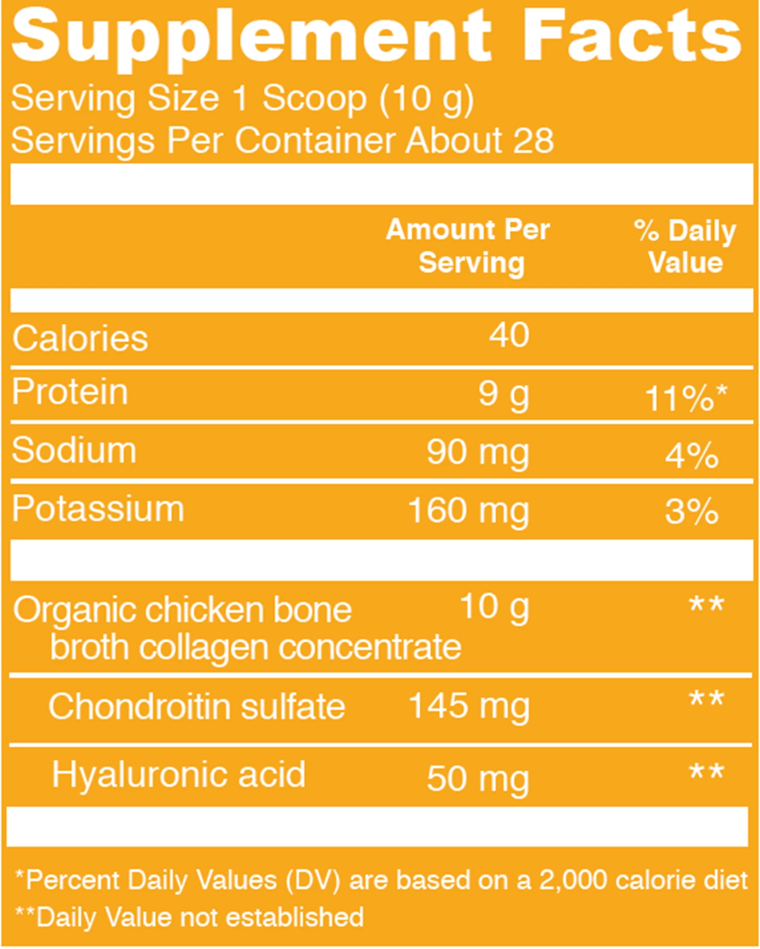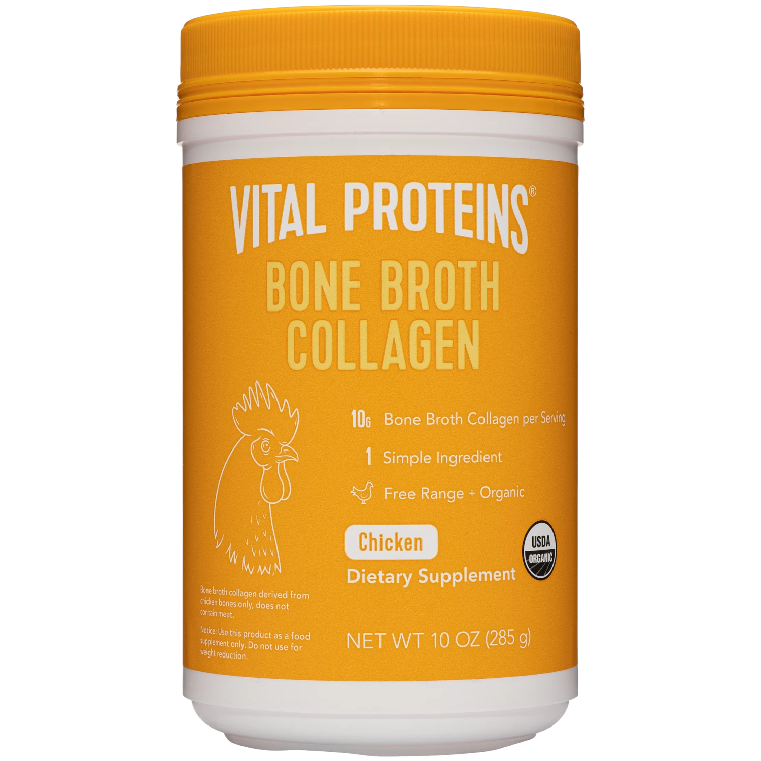 Vital Proteins® USDA Organic Chicken Bone Broth Collagen is crafted from the bones of free-range chickens and helps support healthy hair, skin, nails, bones and joints.** Made with one simple ingredient — organic chicken bone broth powder — the bones are slowly simmered for hours to extract naturally occurring vitamins, minerals and functional ingredients: collagen, chondroitin sulfate and hyaluronic acid.