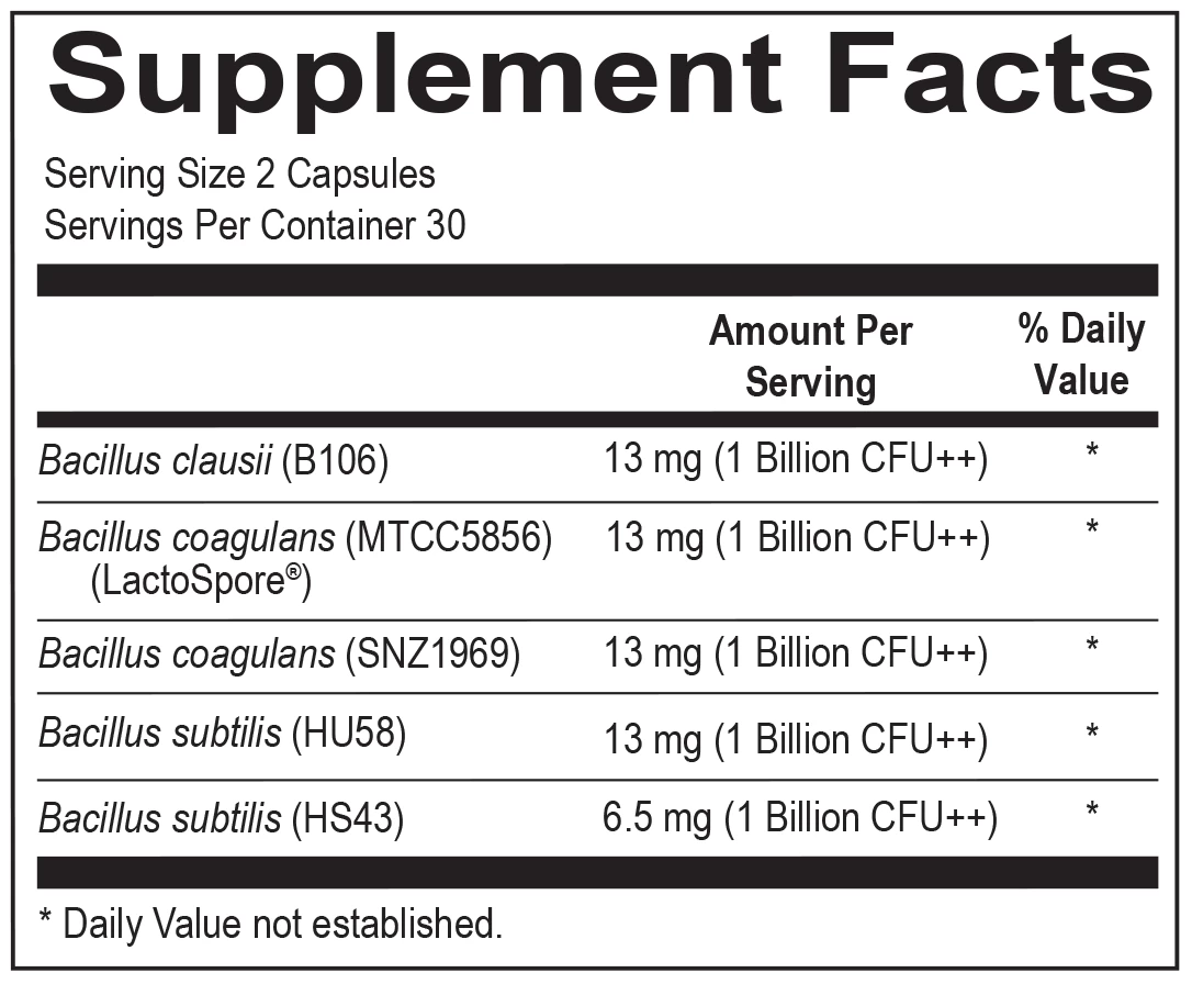Ortho Spore Complete is specifically formulated with several spore-based probiotic strains to promote diversity and balance within the host gut microbiota. Each capsule provides key Bacillus strains that remain in a dormant, protective state in the harsh GI environment, then become active on target to transiently re-establish and recondition the gut.