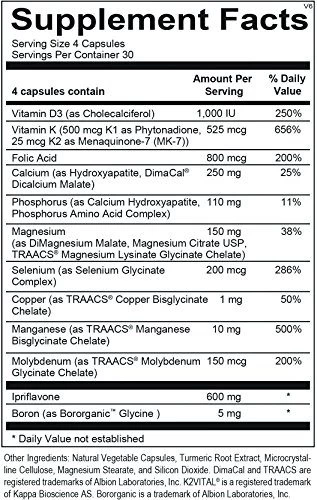 Bone mineral density (BMD) is a major determinant of bone mass and is the most commonly measured quality of bone. A number of factors contribute to BMD including lifestyle factors (regular physical activity, not smoking, minimizing stress levels) and maintaining hormonal balance. Consuming a healthy diet and ensuring optimal levels of bone-building vitamins and minerals are key strategies for preserving bone strength. OsteoPrev is a formulation specifically designed to promote healthy bone density. OsteoPrev contains Albion® TRAACS® chelated minerals for enhanced bioavailability including calcium, magnesium, copper, manganese and molybdenum. OsteoPrev also includes vitamins D and K and phytonutrients to support bone health and increase skeletal strength. Suggested Use: 4 capsules per day in divided doses or as recommended by your health care professional.