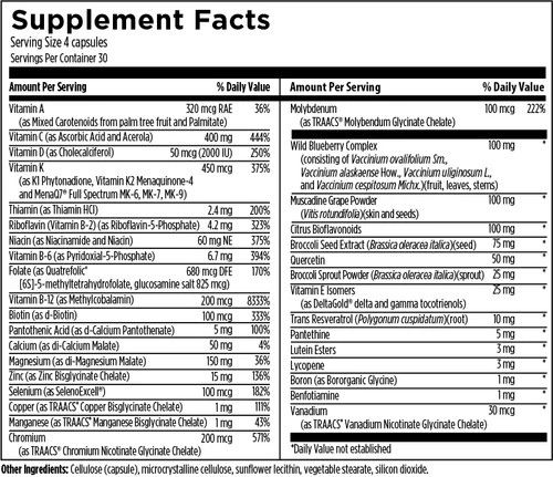 Primal Multi™ is a first-of-its-kind multivitamin, mineral and phytonutrient blend specifically formulated to mimic the nutrient intakes found in an optimal evolutionary human diet. The levels of nutrients provided by Primal Multi™ were devised based on the concept of evolutionary adaptation of human physiology and correspond to a whole food, nutrient-dense diet. The ingredients in Primal Multi™ have been sourced to be naturally occurring or bioidentical. In addition to key vitamins and minerals, this formula includes select phytonutrients proven to have beneficial effects for health* (such as lutein, lycopene, resveratrol, wild blueberry, broccoli seed/sprout, citrus bioflavonoids and more), which were likely consumed in greater quantities in the evolutionary past than they are in the modern diet. Recommended Use: Take four capsules per day, or as directed by your health care practitioner (divided dosing recommended).