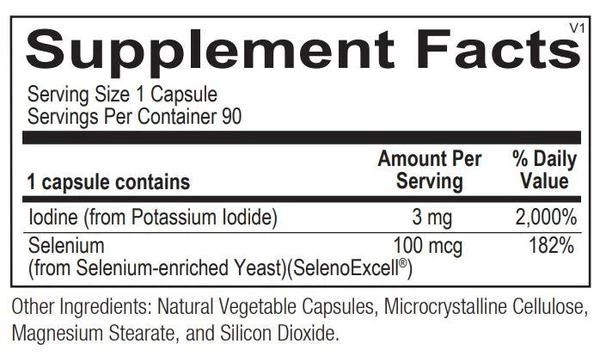 Seleno-Iodide provides a synergistic blend of iodine, along with its trace mineral partner selenium, to help maintain iodine levels and reduce oxidative stress for optimal thyroid and breast health. Seleno-Iodide provides 3 mg of iodine combined with 100 mcg of selenium sourced from SelenoExcell®, a highly bioavailable, organically bound selenium. Suggested Use 1 capsule per day or as recommended by your health care professional.