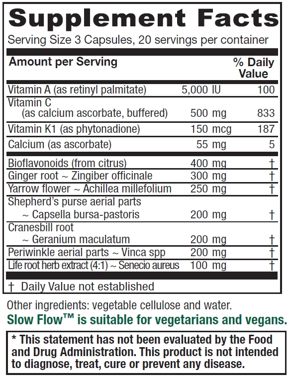 Heavy menstruation and/or prolonged menstruation are two problems that can occur in abnormal menstrual bleeding patterns. A visit to a licensed primary care practitioner is warranted if the bleeding is excessive or consistently prolonged in duration. Slow Flow works to stabilize the blood vessels using astringent herbs and uterine tonics and by using anti-inflammatory agents to help reduce heavy flows. It also promotes slowing of blood loss and normalization the menstrual flow.