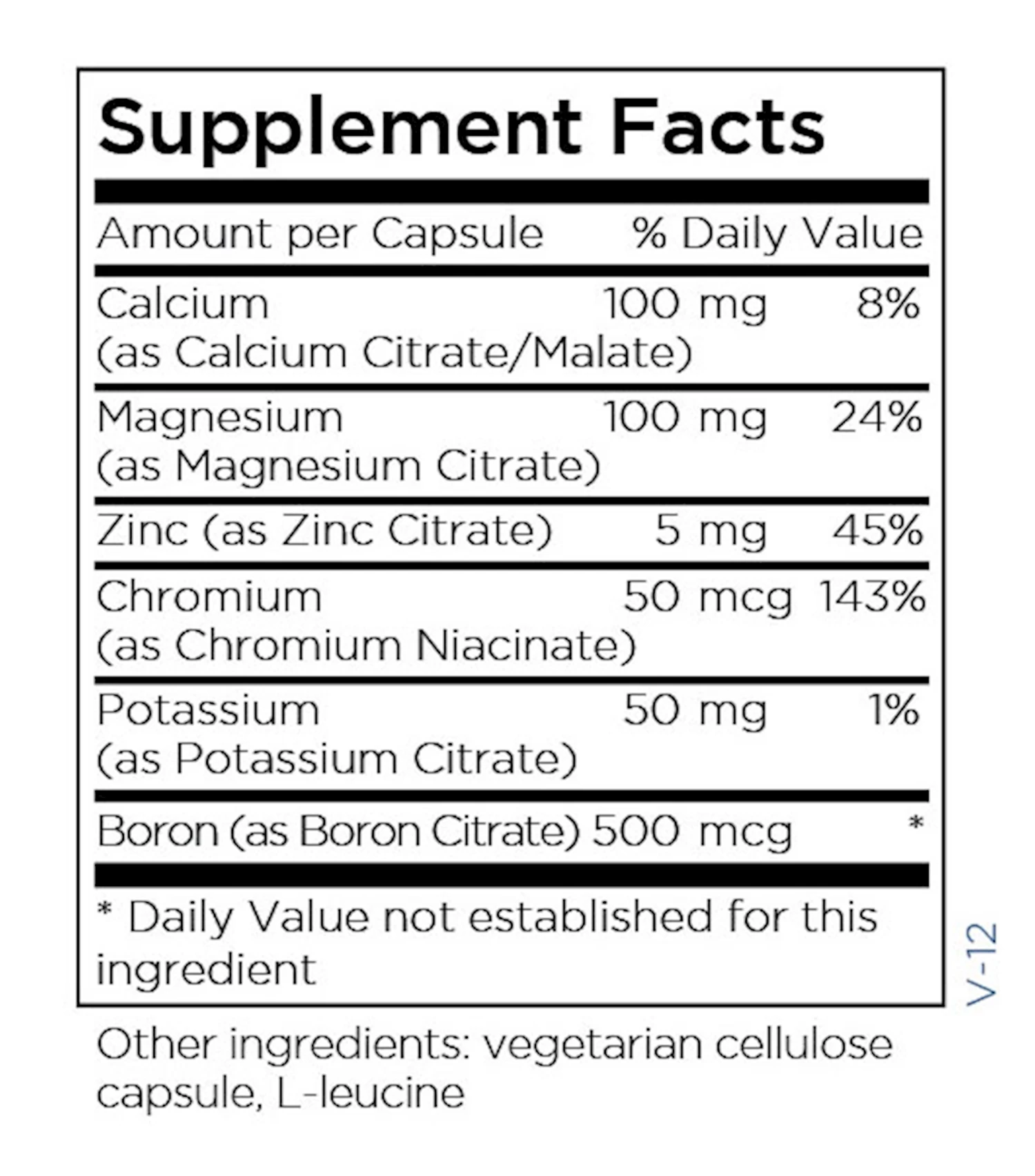 Source Materials: Minerals are mined. Citric acid (for citrates) and L-leucine are made by fermentation. Niacin (for chromium niacinate) and malic acid are synthesized. All ingredients are vegan and non-GMO. Allergens: According to information provided by our suppliers, these capsules are free of the eight major allergens as identified by the Food Allergen Labeling and Consumer Protection Act of 2004 (FALCPA): Wheat (gluten), eggs, milk, soybeans, shellfish, fish, peanuts, tree nuts. Recommendations: Use as directed by a healthcare professional. Precautions: Pregnant or lactating women and individuals taking prescription medications should consult with a healthcare professional before taking any supplement.