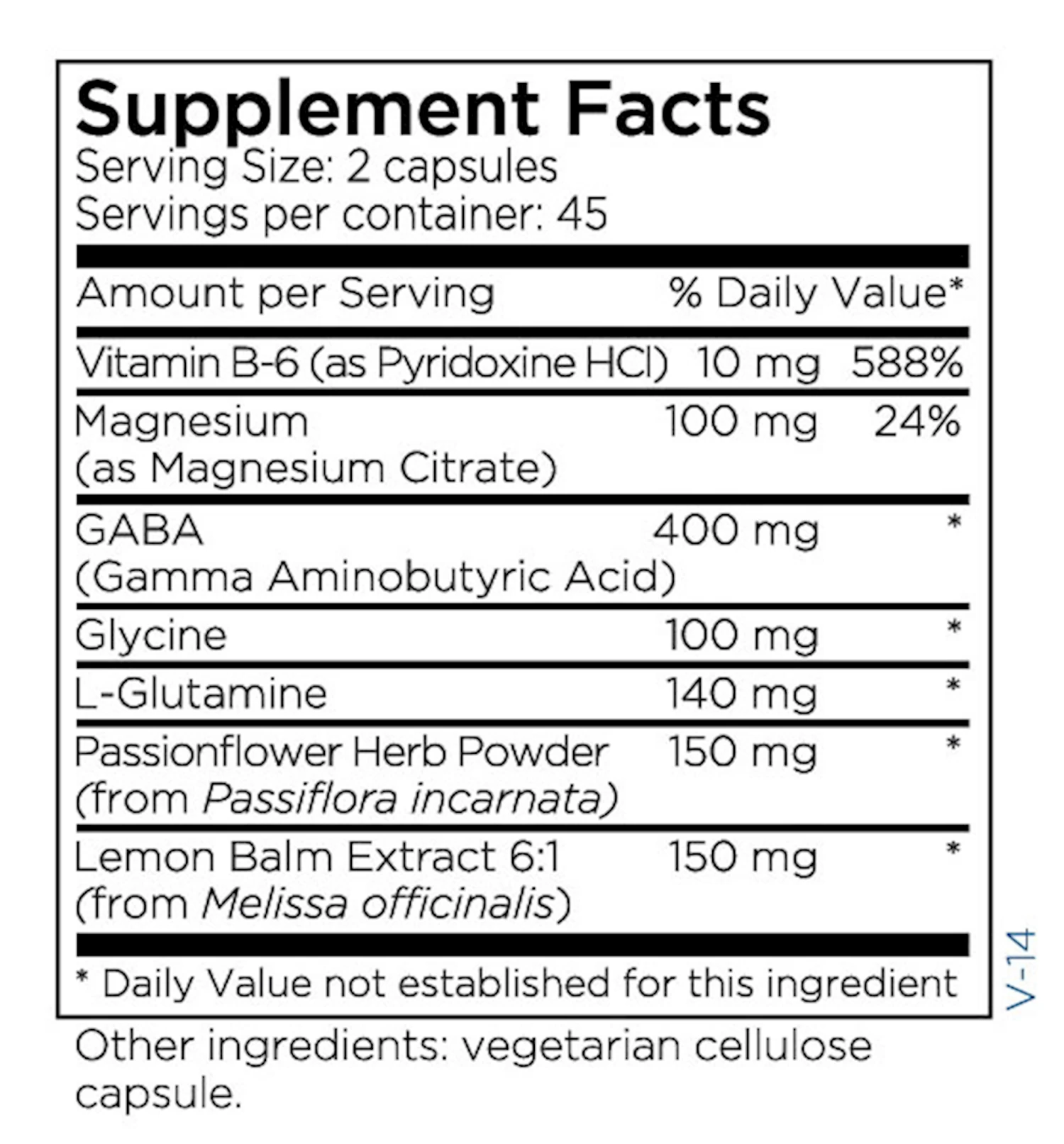 Source Materials: Pyridoxine HCl and glycine are synthetic. L-Glutamine is produced by fermentation of glucose. Magnesium is a mined mineral and citric acid (citrate) from corn glucose fermentation. Passionflower herb powder is prepared from dried aerial parts. Lemon balm extract is prepared from leaves and stems. Cellulose for capsules is derived from softwood tree pulp. All ingredients are vegan and non-GMO.