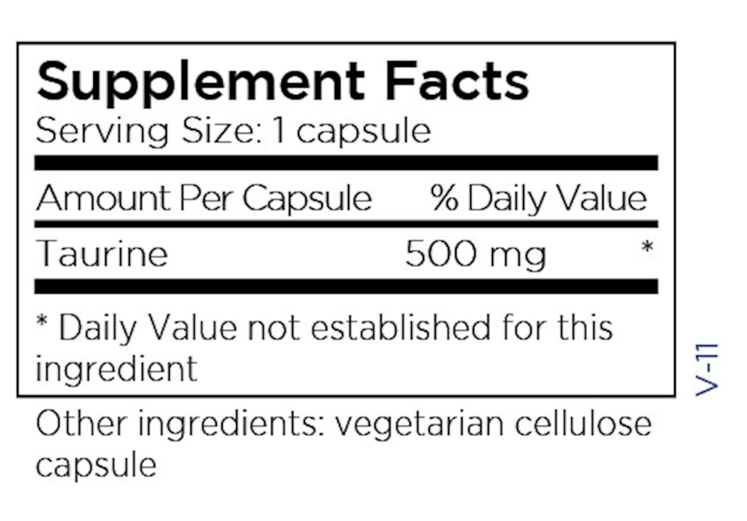 Source Materials: Taurine is made by chemical synthesis. Cellulose for capsules is derived from softwood tree pulp. All ingredients are vegan and non-GMO. Allergens: According to information provided by our suppliers, these capsules are free of the eight major allergens as identified by the Food Allergen Labeling and Consumer Protection Act of 2004 (FALCPA): Wheat (gluten), eggs, milk, soybeans, shellfish, fish, peanuts, tree nuts. Recommendations: Use as directed by a healthcare professional. Precautions: Pregnant or lactating women and individuals taking prescription medications should consult with a healthcare professional before taking any supplement.