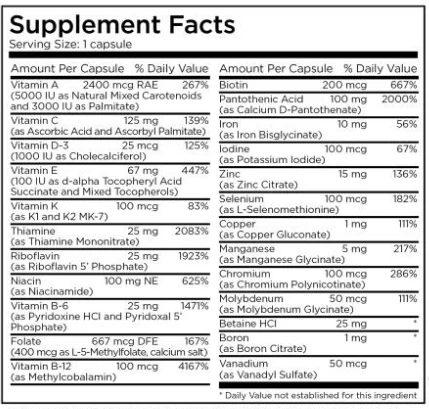 Source Materials: Vitamin A palmitate, vitamin K-1, thiamine mononitrate, niacinamide, pyridoxal 5 phosphate, L-methylfolate, biotin, and pantothenic acid: synthetic. Natural mixed carotenoids: carrot and marigold extracts. Ascorbic acid: corn sorbitol. Ascorbyl palmitate: ascorbic acid from corn and palmitic acid from palm oil. Vitamin D3: lanolin from sheep’s wool. Vitamin E succinate and mixed tocopherols: purified soy oil. Vitamin K-2 M7: soy fermentation (soy removed). Riboflavin 5 phosphate and methylcobalamin: dextrose fermentation. Betaine HCl: sugar beets. Minerals are mined. Chelating agents include: glycine (synthetic), citric acid (corn fermentation), methionine (synthetic), glucuronic acid (synthetic). Cellulose for capsules is derived from softwood tree pulp. There is no detectable GM material present.
