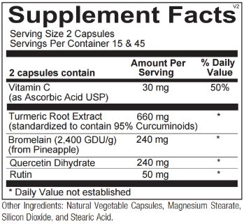 Turmeric Root Extract Turmeric is a bright orange-colored spice that has been in use for thousands of years in cooking and medicine. Curcumin has been shown to play a crucial role in maintaining normal inflammatory balance in a variety of bodily systems due to its strong NFkB-modulating properties. Bromelain Bromelain is a proteolytic enzyme derived from the stem of the pineapple plant. Bromelain has been shown to support musculoskeletal health and normal inflammatory balance by working on the kinin pathways and inhibiting arachidonic acid formation via phospholipase A. Quercetin A flavonoid found in a variety of botanicals, vegetables and fruits, quercetin is a potent antioxidant which inhibits inducible ICAM-1 expression, an important pathway for maintaining normal inflammatory balance. Rutin Rutin is a flavonoid that has been shown to help maintain normal inflammatory balance. Rutin helps maintain levels of the major antioxidant in the body, glutathione. Rutin also works in synergy with other flavonoids such as quercetin to support connective tissue health by inhibiting the enzymes that break down connective tissue: hyaluronidase, collagenase, LOX and COXs.