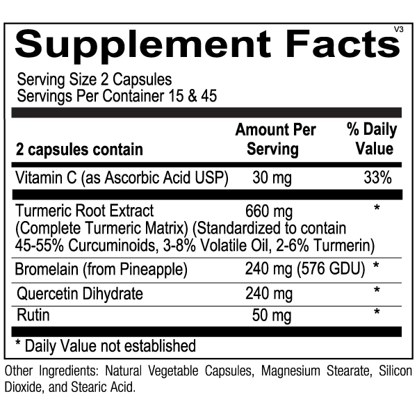Turmeric Root Extract Turmeric is a bright orange-colored spice that has been in use for thousands of years in cooking and medicine. Curcumin has been shown to play a crucial role in maintaining normal inflammatory balance in a variety of bodily systems due to its strong NFkB-modulating properties. Bromelain Bromelain is a proteolytic enzyme derived from the stem of the pineapple plant. Bromelain has been shown to support musculoskeletal health and normal inflammatory balance by working on the kinin pathways and inhibiting arachidonic acid formation via phospholipase A. Quercetin A flavonoid found in a variety of botanicals, vegetables and fruits, quercetin is a potent antioxidant which inhibits inducible ICAM-1 expression, an important pathway for maintaining normal inflammatory balance. Rutin Rutin is a flavonoid that has been shown to help maintain normal inflammatory balance. Rutin helps maintain levels of the major antioxidant in the body, glutathione. Rutin also works in synergy with other flavonoids such as quercetin to support connective tissue health by inhibiting the enzymes that break down connective tissue: hyaluronidase, collagenase, LOX and COXs.
