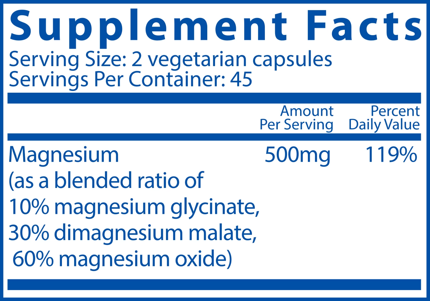 Triple Magnesium combines three unique forms of Magnesium – Oxide, Malate and Glycinate. Magnesium activates enzymes that are essential in many functions of the body, and promotes the normal metabolism of fat, carbohydrates and amino acids.* It supports healthy teeth and maintains bone density.* Magnesium helps maintain blood pressure levels that are already in the normal range as well as helping to maintain normal mood and emotional well-being premenstrually, and during the menstrual cycle.* Triple Mag contains magnesium oxide, a small and compact molecule that delivers one of the highest percentages of elemental magnesium per dose, making it an effective choice for someone who wants to take as few capsules as possible.* Due to its osmotic effect in the colon, it also helps support regular and comfortable elimination.*