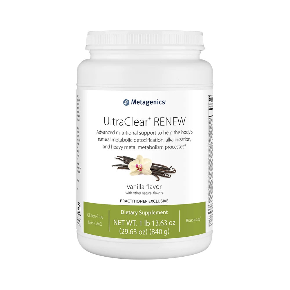 UltraClear® RENEW Vanilla is formulated to deliver advanced, specialized nutritional support for Phase I, II, and III detoxification, with enhanced support for the body’s natural alkalinization and heavy metal metabolism processes. Formulated in a base of 14.5 g OptiProtein®—12 g of proprietary, vegan pea/rice protein and 2.5 g of added amino acids—this novel formula features xanthohumol as XNT ProMatrix®, broccoli sprout and floret powder as Brassinase™, and prune and pomegranate extracts to promote healthy cellular activities. UltraClear RENEW also features glycine and magnesium sulfate to support Phase II detoxification activities, along with N-acetyl-L-cysteine, green tea catechins, and beta-carotene and vitamins C and E to provide antioxidant support. Vanilla Flavor, 840g.