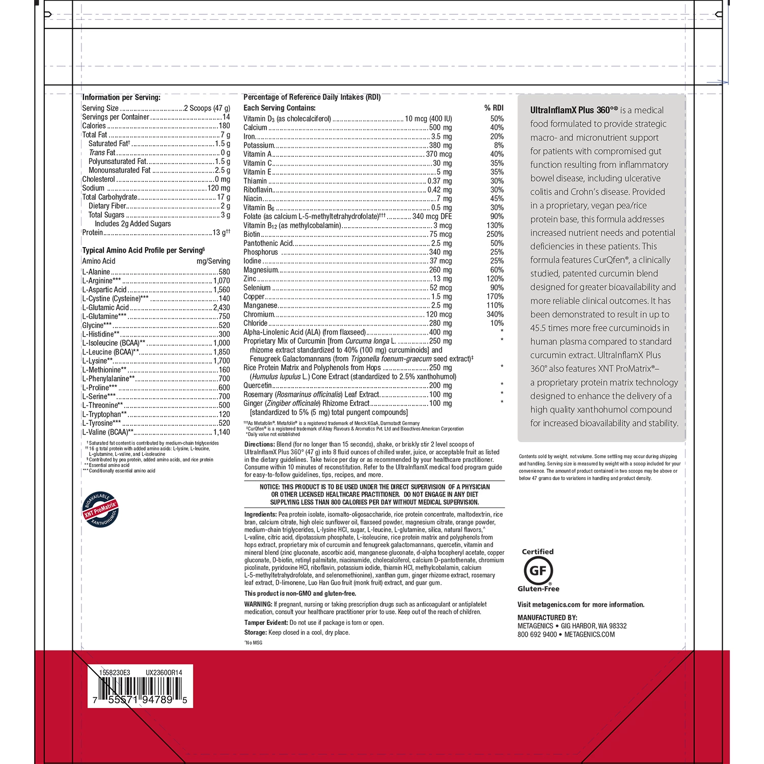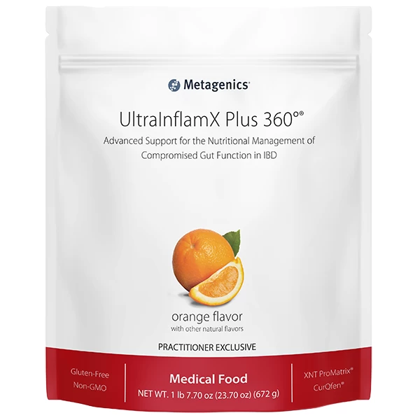 Blend (for no longer than 15 seconds), shake, or briskly stir 2 level scoops of UltraInflamX Plus 360° (47 g) into 8 fluid ounces of chilled water, juice, or acceptable fruit as listed in the dietary guidelines. Take twice per day or as recommended by your healthcare practitioner. Consume within 10 minutes of reconstitution. Refer to the UltraInflamX medical food program guide for easy-to-follow guidelines, tips, recipes, and more.
