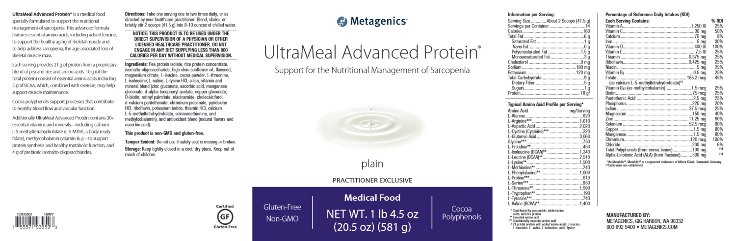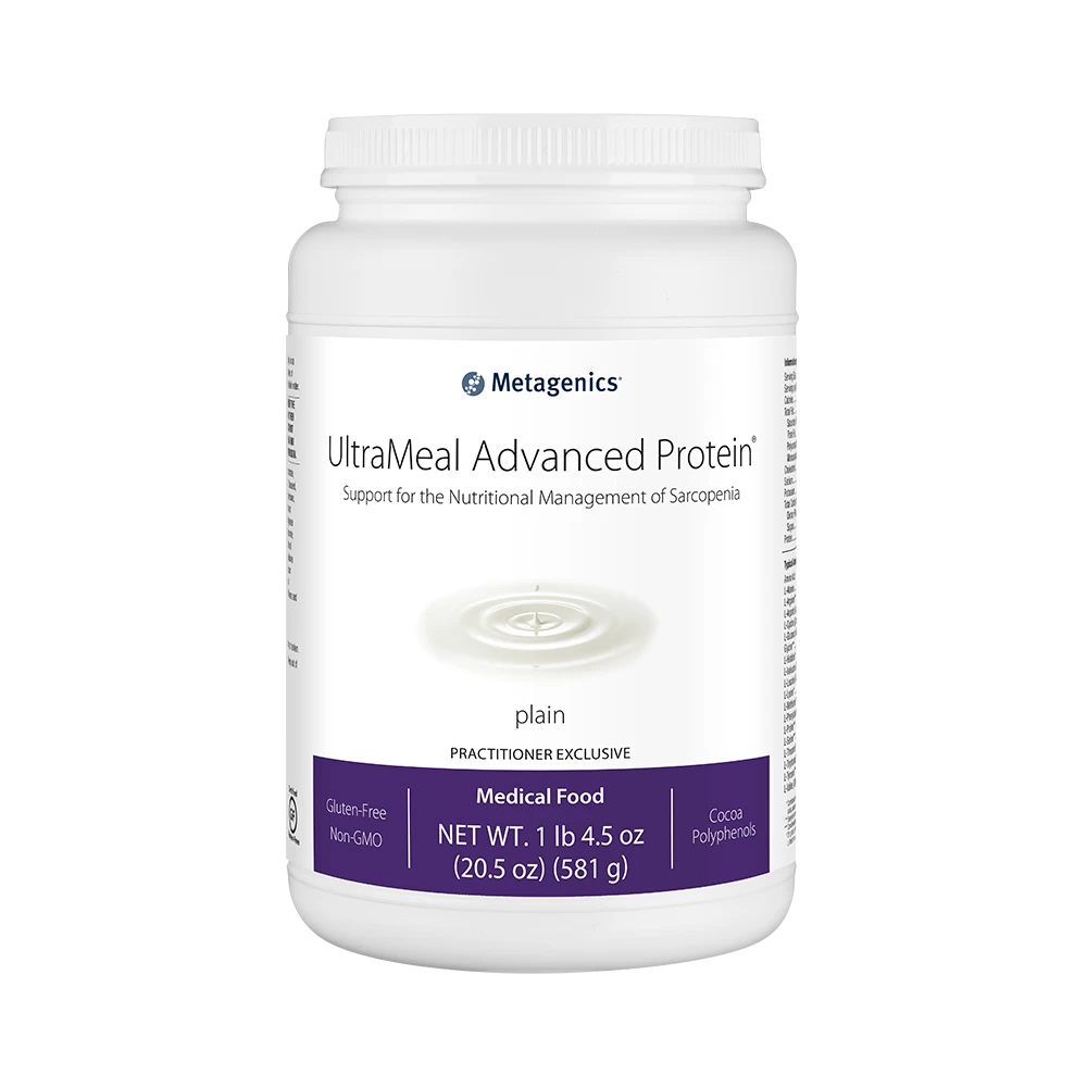 This advanced formula provides essential amino acids, including added leucine, to support the healthy aging of skeletal muscle and to help address sarcopenia, the age-associated loss of skeletal muscle mass. Each serving provides 20 g protein and amino acids, including 10 g of essential amino acids of which 5 g are branched-chain amino acids. Combined with appropriate exercise, supplementation with essential amino acids and especially of branched-chain amino acids may help improve skeletal muscle mass. Half of the protein provided by UltraMeal Advanced Protein consists of essential amino acids for better support of muscle protein synthesis. Compared to more common dietary proteins, essential amino acids (and especially branched-chain amino acids) appear to be more rapidly absorbed and better utilized by skeletal muscle for the synthesis of new muscle tissue. UltraMeal Advanced Protein also features cocoa polyphenols to help maintain endothelium-dependent vasodilation, which contributes to healthy blood flow. Cocoa polyphenols augment nitric oxide synthesis in blood vessels, which supports healthy vascular function. Additionally, UltraMeal Advanced Protein contains 25 essential vitamins and minerals to support protein synthesis and healthy metabolic function and includes 4 g of prebiotic fiber.