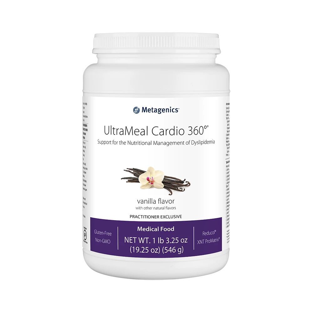 Clinically tested UltraMeal Plus 360° is a low-glycemic index, satisfying medical food designed to nutritionally support the management of conditions associated with metabolic syndrome and cardiovascular disease. It features selective kinase response modulators (SKRMs) designed to improve fasting insulin and lipid parameters. The UltraMeal Plus 360° Program has been clinically tested and shown to address specific cardiovascular disease risk factors more effectively than a low-glycemic-load (LGL) eating plan and exercise alone.