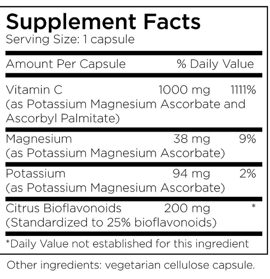 Source Materials: Potassium magnesium ascorbate is made by combining ascorbic acid (corn sorbitol fermentation) with magnesium oxide and potassium chloride (mined or extracted from salt water). Cellulose for capsules is derived from softwood tree pulp. All ingredients are vegan and non-GMO. Allergens: According to information provided by our suppliers, these capsules are free of the eight major allergens as identified by the Food Allergen Labeling and Consumer Protection Act of 2004 (FALCPA): Wheat (gluten), eggs, milk, soybeans, shellfish, fish, peanuts, tree nuts. Recommendations: One (1) capsule daily with a meal, or as directed by a healthcare professional. Precautions: Pregnant or lactating women and individuals taking prescription medications should consult with a healthcare professional before taking any supplement.