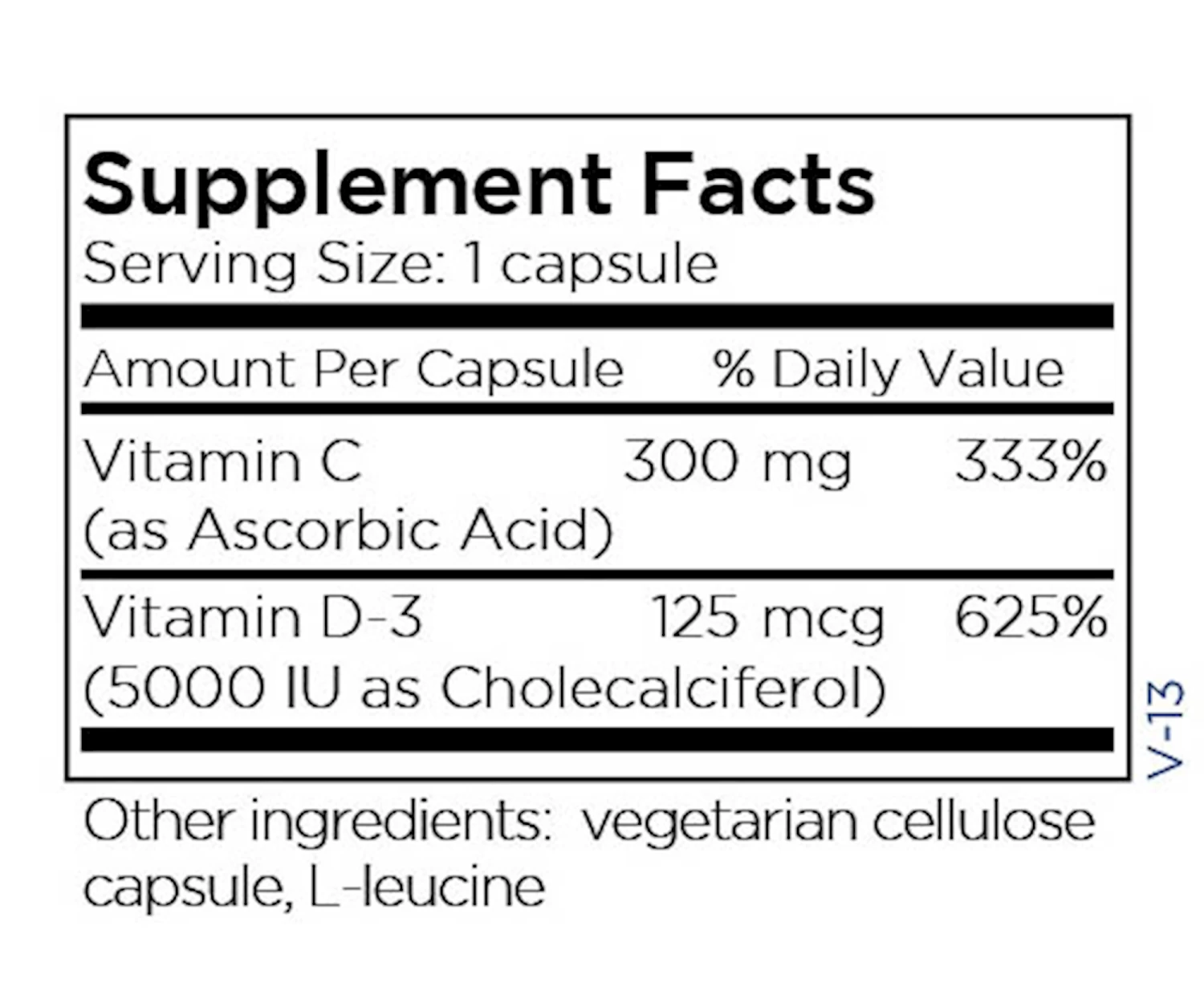 Source Materials: Vitamin D-3 is derived from cholesterol from lanolin (sheep’s wool oil). Vitamin C is derived from corn sorbitol. L-leucine is derived by fermentation of cane sugar. Cellulose for capsules is derived from softwood tree pulp. There is no detectable GM material present. Allergens: According to information provided by our suppliers, these capsules are free of the eight major allergens as identified by the Food Allergen Labeling and Consumer Protection Act of 2004 (FALCPA): Wheat (gluten), eggs, milk, soybeans, shellfish, fish, peanuts, tree nuts. Recommendations: One (1) capsule daily with a meal, or as directed by a healthcare professional. Precautions: Pregnant or lactating women and individuals taking prescription medications should consult with a healthcare professional before taking any supplement. Source Materials: Vitamin D-3 is derived from cholesterol from lanolin (sheep’s wool oil). Vitamin C is derived from corn sorbitol. L-leucine is derived by fermentation of cane sugar. Cellulose for capsules is derived from softwood tree pulp. There is no detectable GM material present. Allergens: According to information provided by our suppliers, these capsules are free of the eight major allergens as identified by the Food Allergen Labeling and Consumer Protection Act of 2004 (FALCPA): Wheat (gluten), eggs, milk, soybeans, shellfish, fish, peanuts, tree nuts. Recommendations: One (1) capsule daily with a meal, or as directed by a healthcare professional. Precautions: Pregnant or lactating women and individuals taking prescription medications should consult with a healthcare professional before taking any supplement.